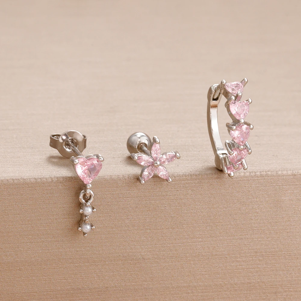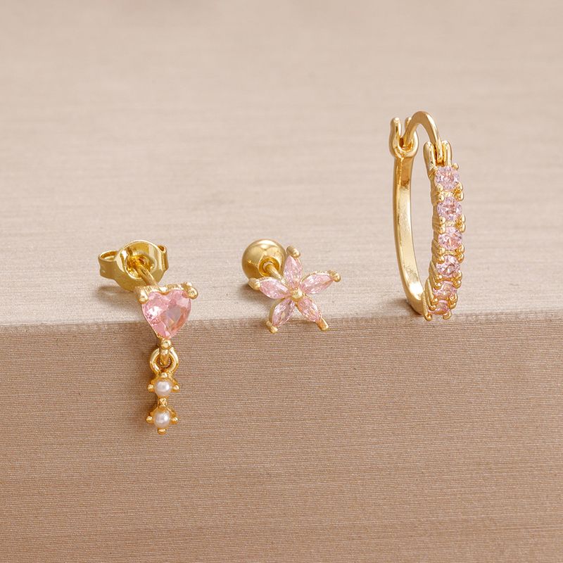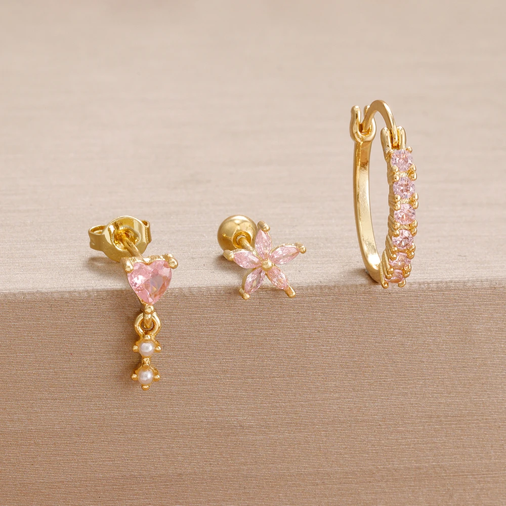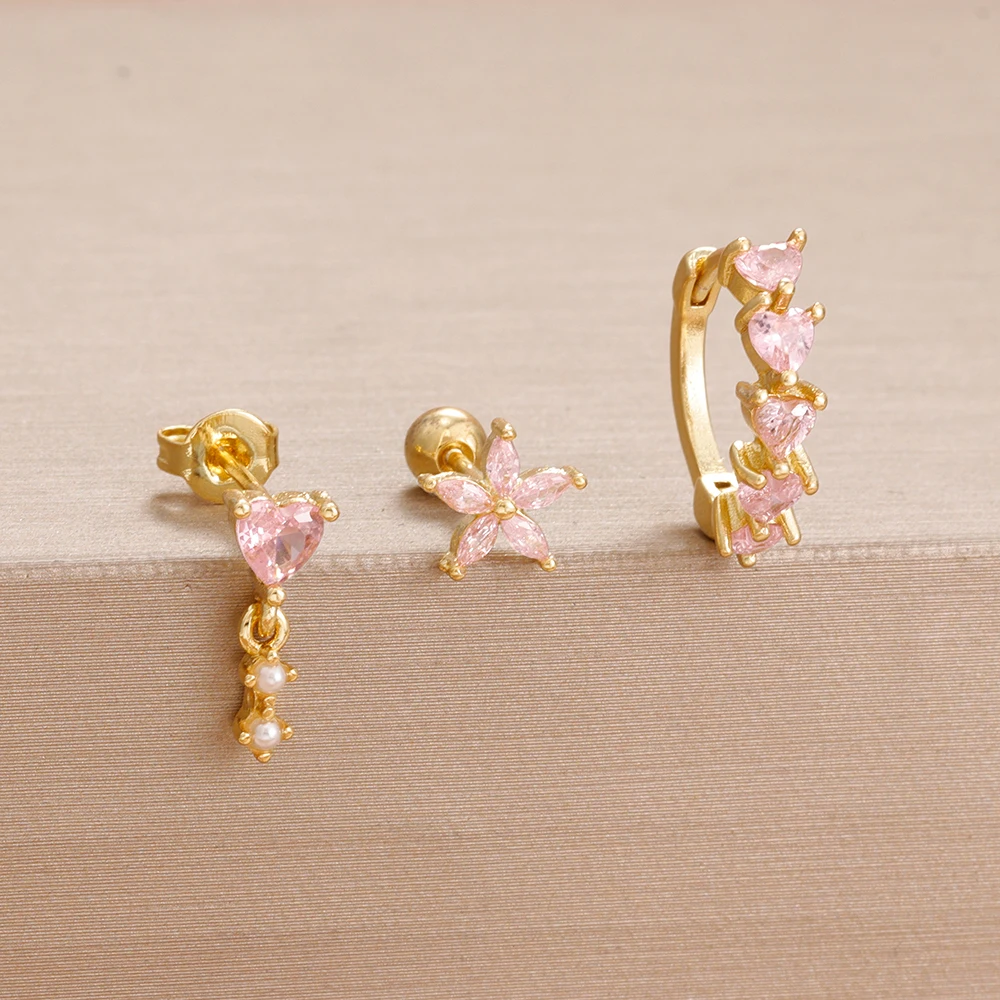3PCS Cute Pink Crystal Flower Heart Hoop Earring Set Fashion 14K Gold Plated Geometric Ear Stud Pendant Earring Piercing Jewelry