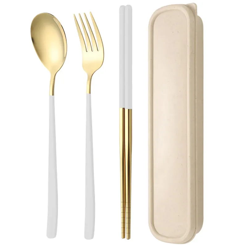 3pcs Gold Korean Dinnerware Set Chopsticks Fork Spoon Cutlery Set with Storage Box Stainless Steel Flatware Portable Tableware
