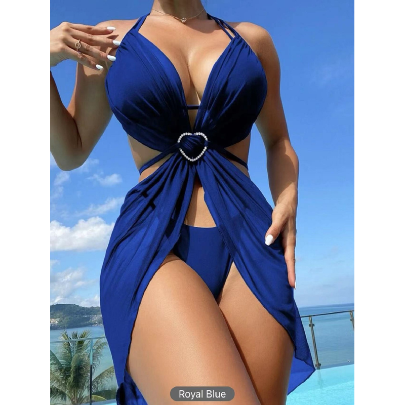 3pcs Halter Neck Bikini Beach Summer Solid Color Split Swimsuit Womens Clothing Blue S