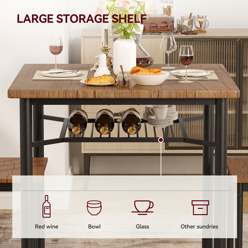 🍽️Space-Saving Design Perfect for Small Homes:Ideal for apartments, studios, or condos, the chairs tuck neatly under the compact 46.46"L × 27.16"W × 31.86"H table. The integrated wine rack and lower storage shelf elegantly showcase bottles, snacks, or magazines — maximizing style and function in tight spaces.