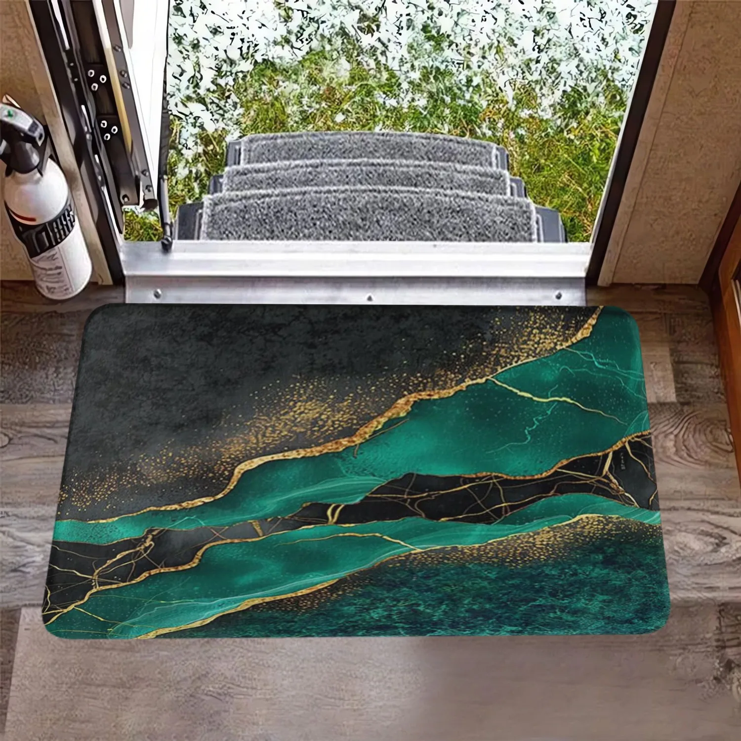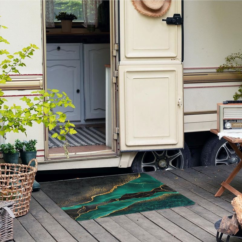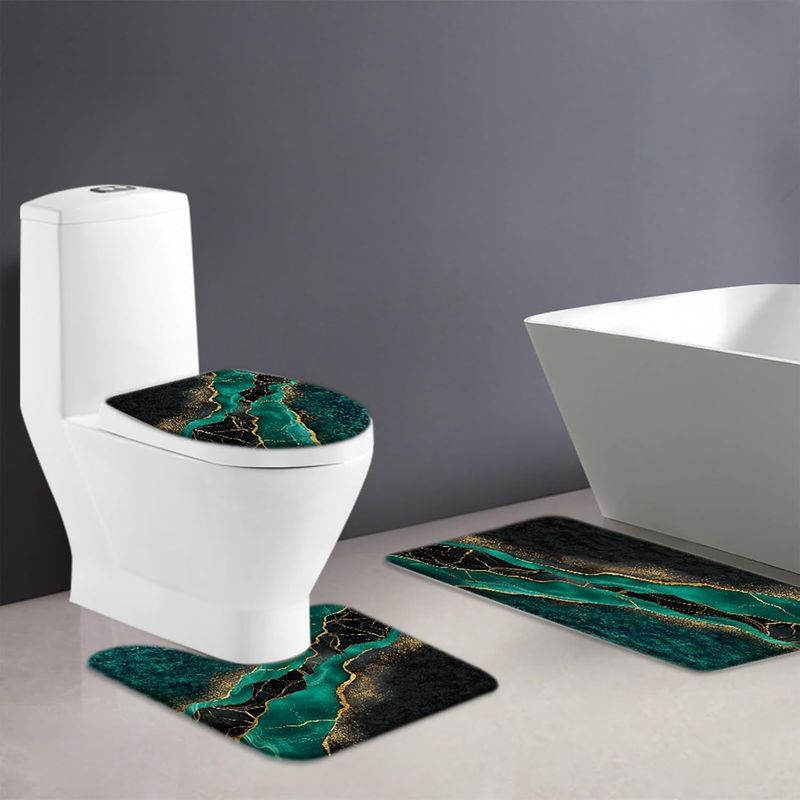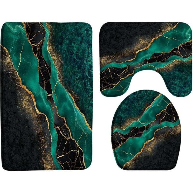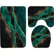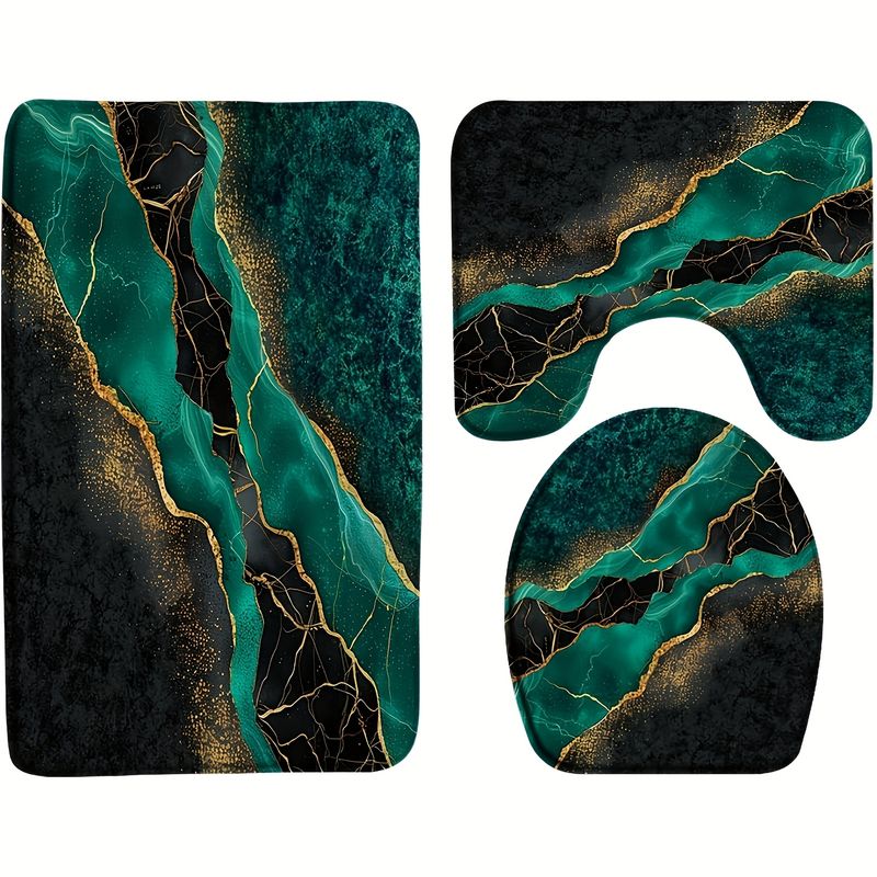 3pcs Luxury RV Marble Texture Floor Mat Set - Abstract Teal & Golden Design, Non-Slip, Absorbent Bath Mats with Toilet Lid Cover