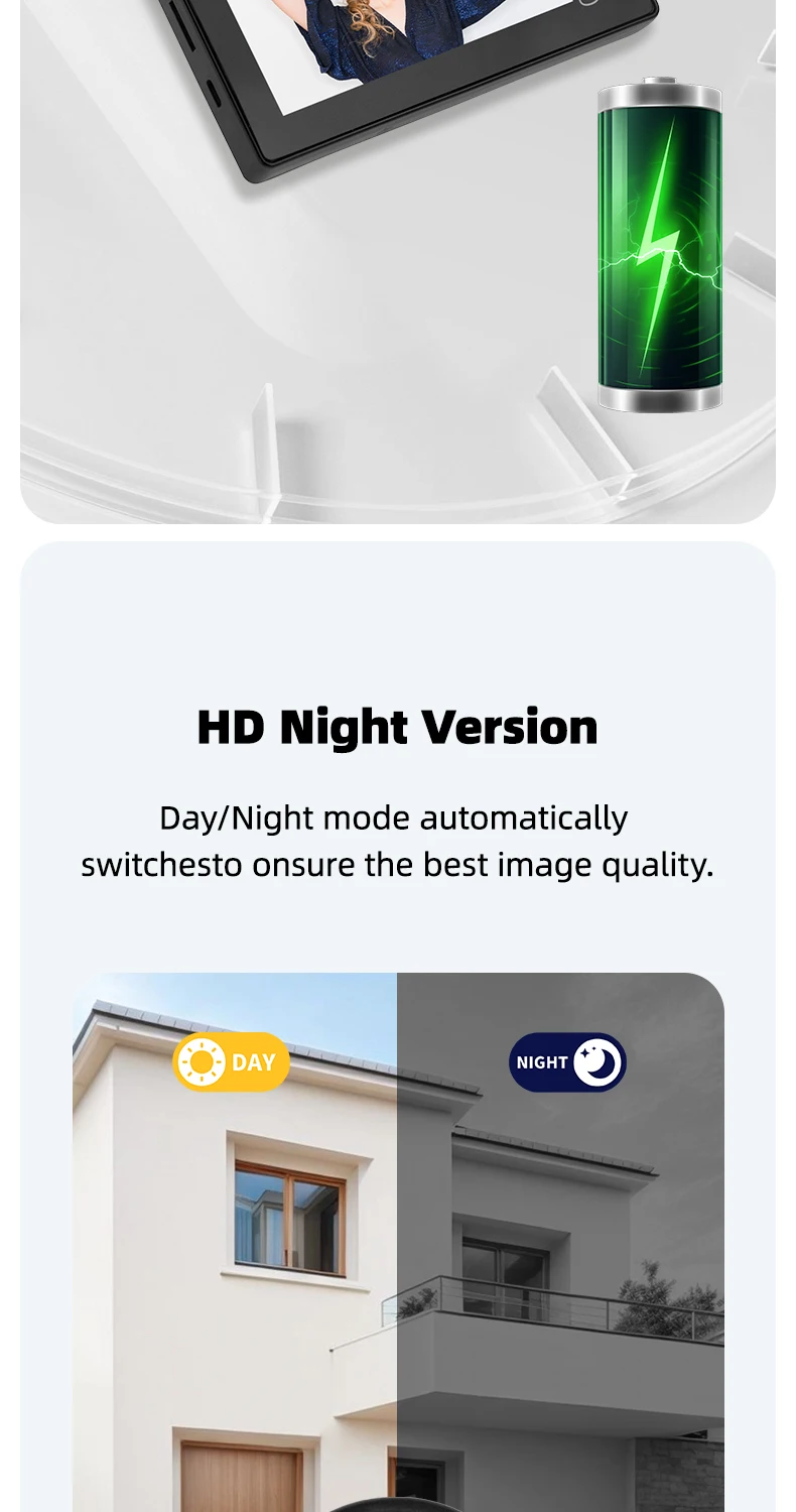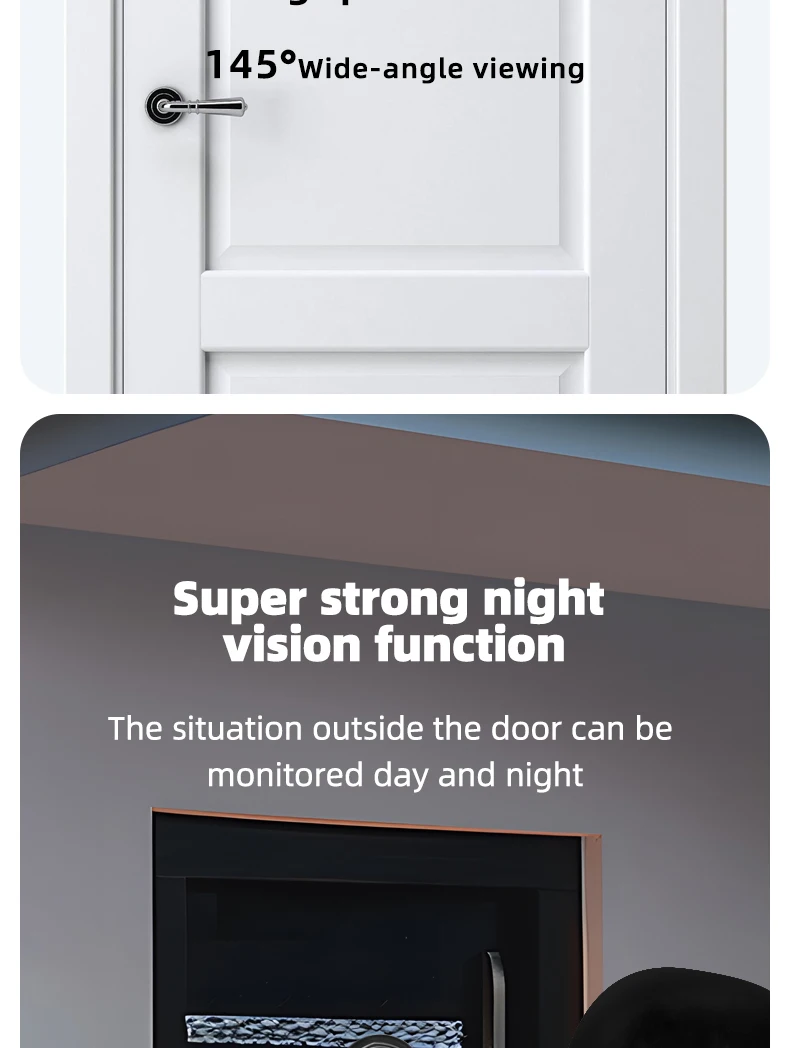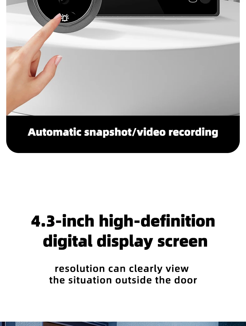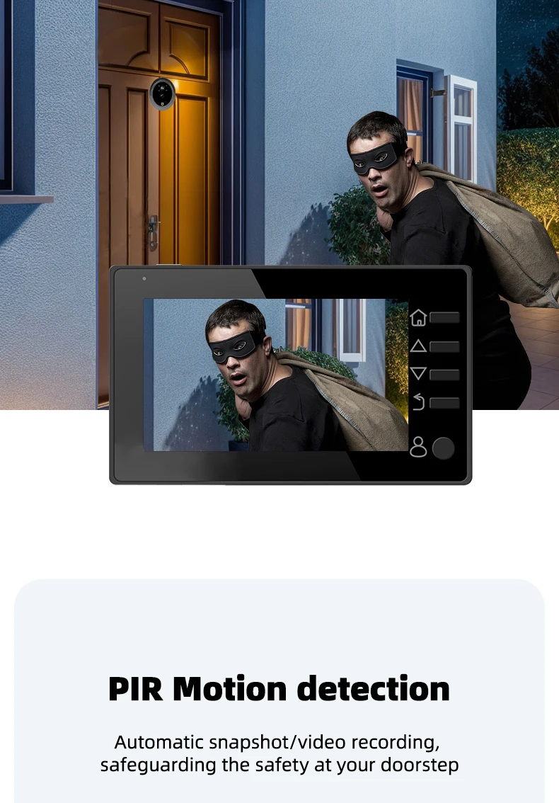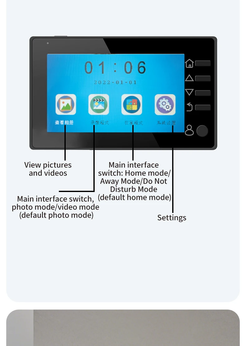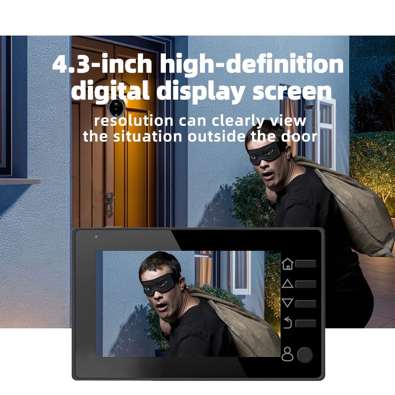 1. The product adopts energy-saving mode, and enters automatic standby mode after ten seconds of screen shutdown. When you need to use it, press the menu button to turn on and check the situation outside the door.