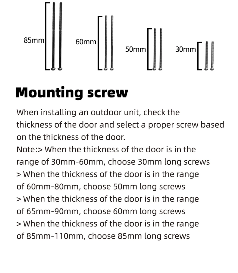When installing the outdoor unit, please first confirm the thickness of the door and select the appropriate screw according to the thickness of the door
