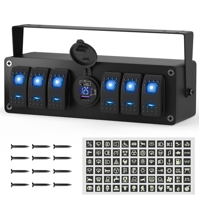 6 Gang Rocker Switch Box: This 6 gang rocker switch box comes with 6pcs 12V 20A/24V 10A dual LED marine rocker switches. Package also comes with 1 pcs of waterproof night glow sticker label, it can show words and patterns at night easily when LED light on, which makes you can see more clearly and safely in the dark