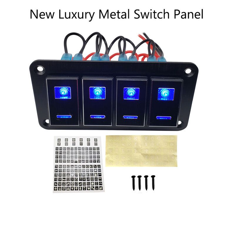 4x LED illuminated marine grade rocker switches, presented with vehicle and marine labels, easy for DIY.
