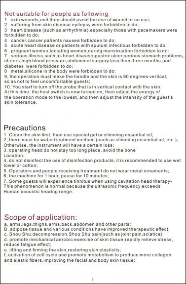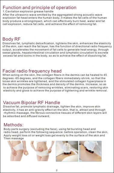 Utilizing gathered strong sound wave explosion fat head of the emitted sound waves 40KHZ into the human body, after it allows the body's fat cells produce a strong impact, can effectively burn calories, moisture and fat cells blasting, fat cells decreased, so as to achieve the effect of the removal of fat.