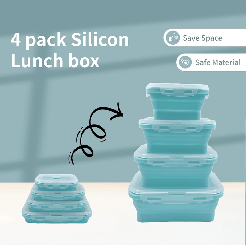 4 Pack Silicon Lunch Box Flat Stacks Collapsible Food Storage Containers With Lids Leftover Meal Box For Kitchen BPA Free