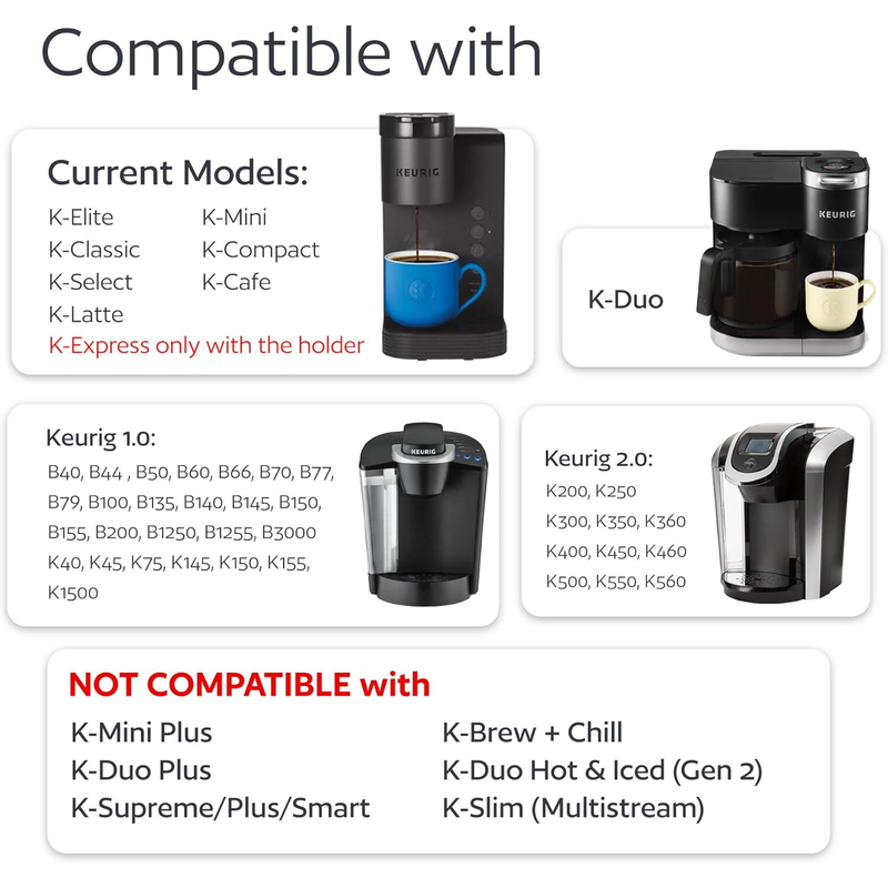 NOT COMPATIBLE with K-Mini Plus, K-Duo Plus, Keurig K-Supreme/Plus/Smart, K-Slim (Multistream), K-Brew+Chill, K-Duo Hot & Iced(Gen 2).