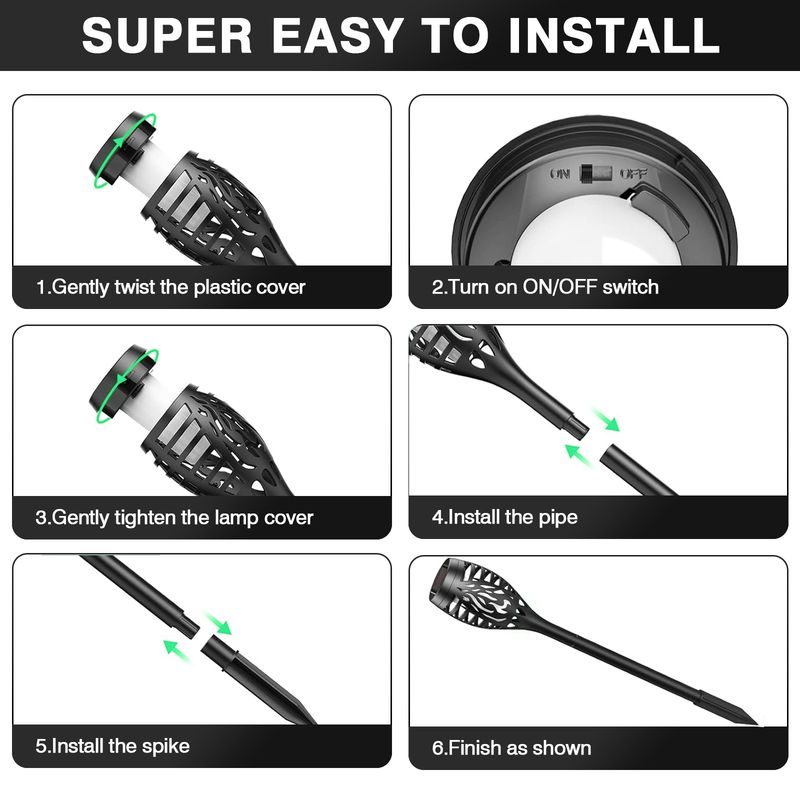 【Easy Installation】No wiring, screws and other tools needed. Just connect the parts and stake into the ground under direct sunshine. Perfect for gardens, pathways, driveways, and more, these LED Solar Flame Lights add a stylish and functional touch to your outdoor decor.