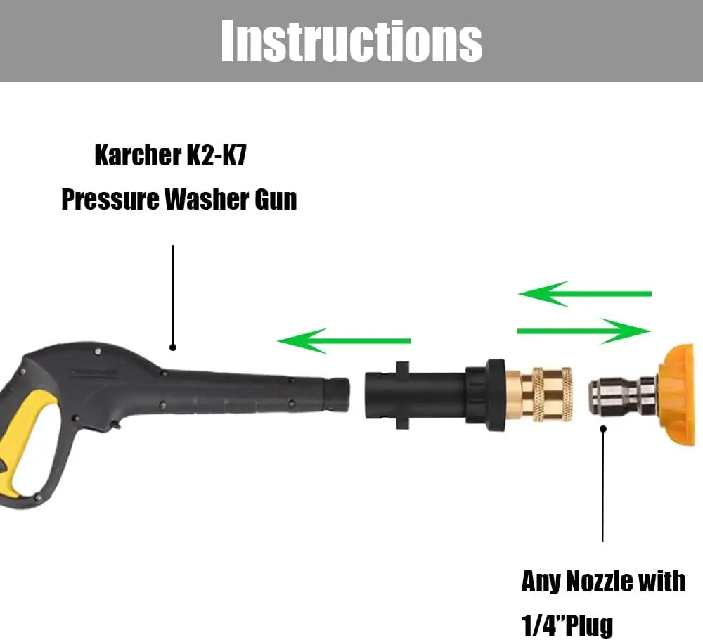 It is adaptor for Karcher K2 K3 K4 K5 K7 Wash gun to 1/4" Quick Connect, you can use any car wash accessores which is with
