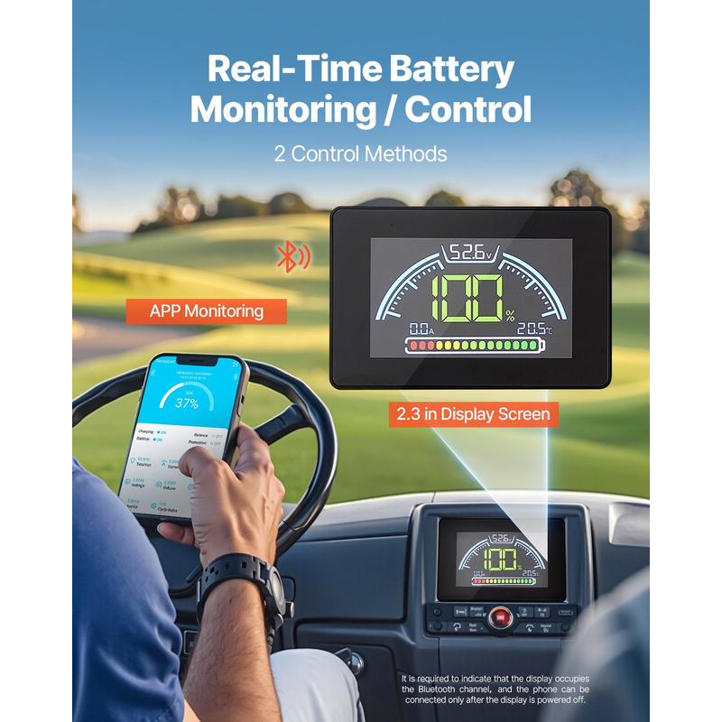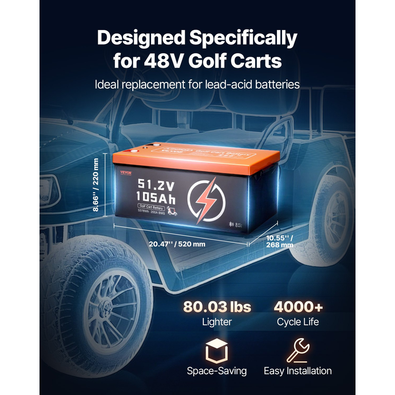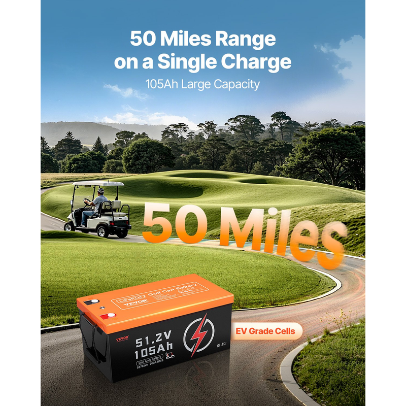 Exceptional Performance: The 51.2VDC 105Ah LiFePO4 golf cart battery is made with EV-grade LiFePO4 cells, delivering outstanding performance. Say goodbye to range anxiety-enjoy a 50-mile range on a single charge.