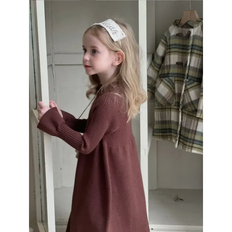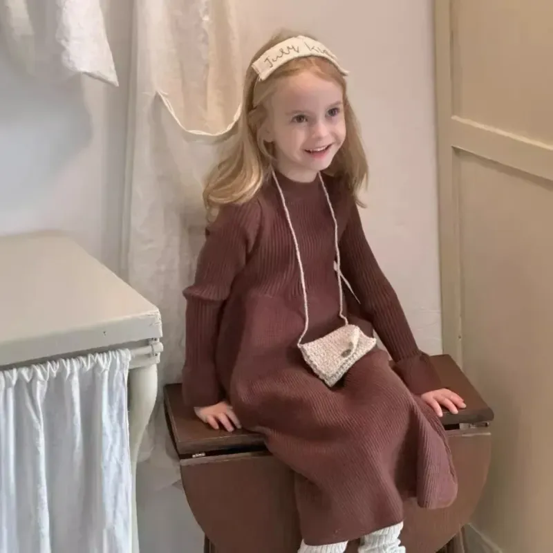4950-1 Girls Dress 2024 Autumn and Winter New Korean Children's Solid Color Knitted Princess Dress Baby Long Sweater Skirt.