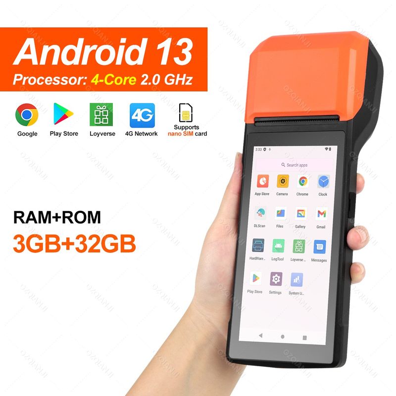 1. Intelligent portable POS terminal device, performs well as receipt printer and camera, supports 4 G, WiFi, Bluetooth 4.0, 1GB +8GB NAND Flash, or 3GB +32GB NAND Flash