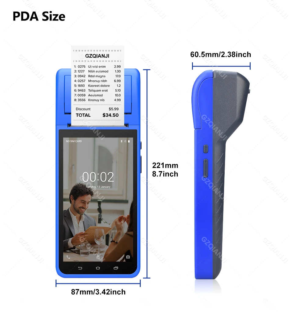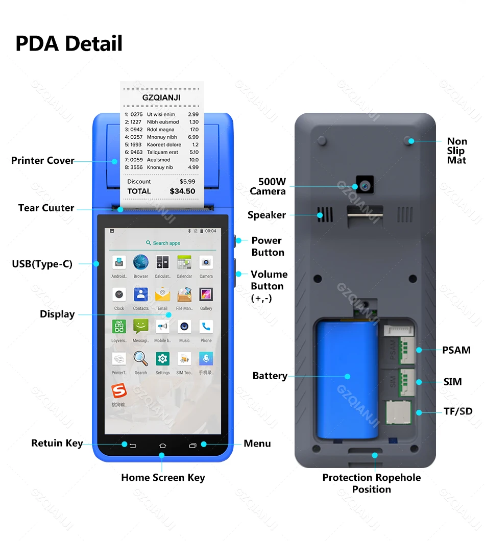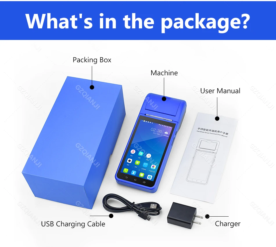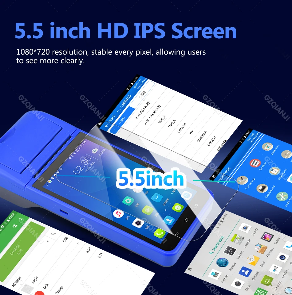 1. Intelligent portable POS terminal device, performs well as receipt printer and camera, supports 4 G, WiFi, Bluetooth 4.0, 1GB +8GB NAND Flash, or 3GB +32GB NAND Flash