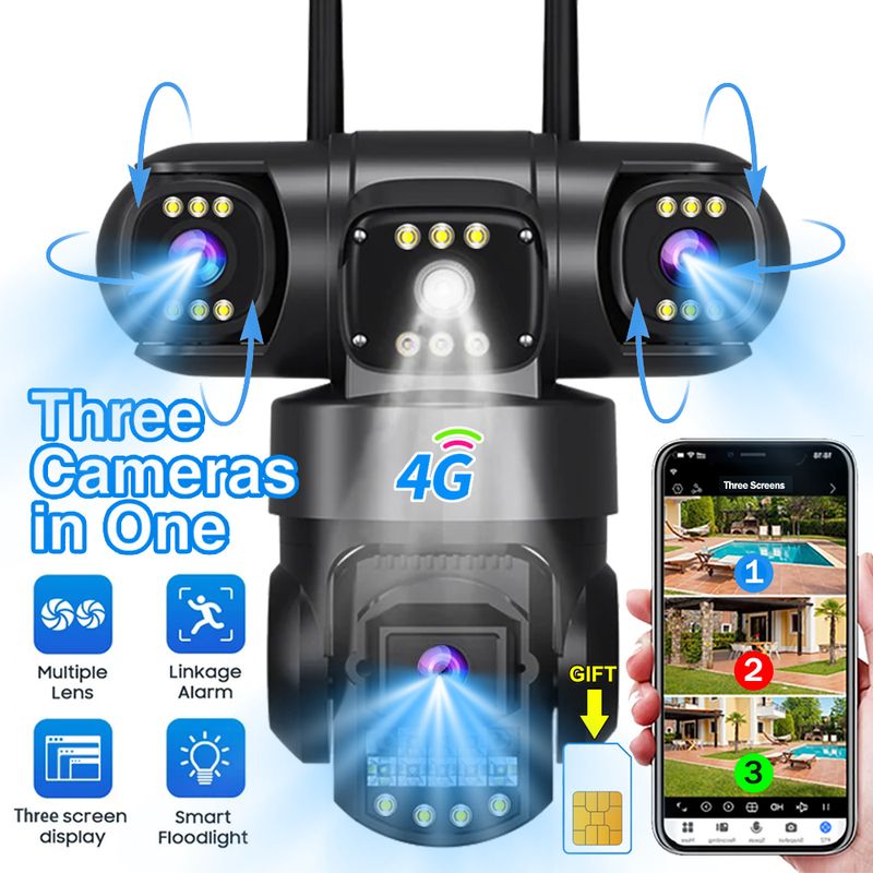 4G Camera With Sim Card 12MP 6K Three Lens Three Screen Monitor Night Vision Security Protection V380 Pro PTZ Video Surveillance