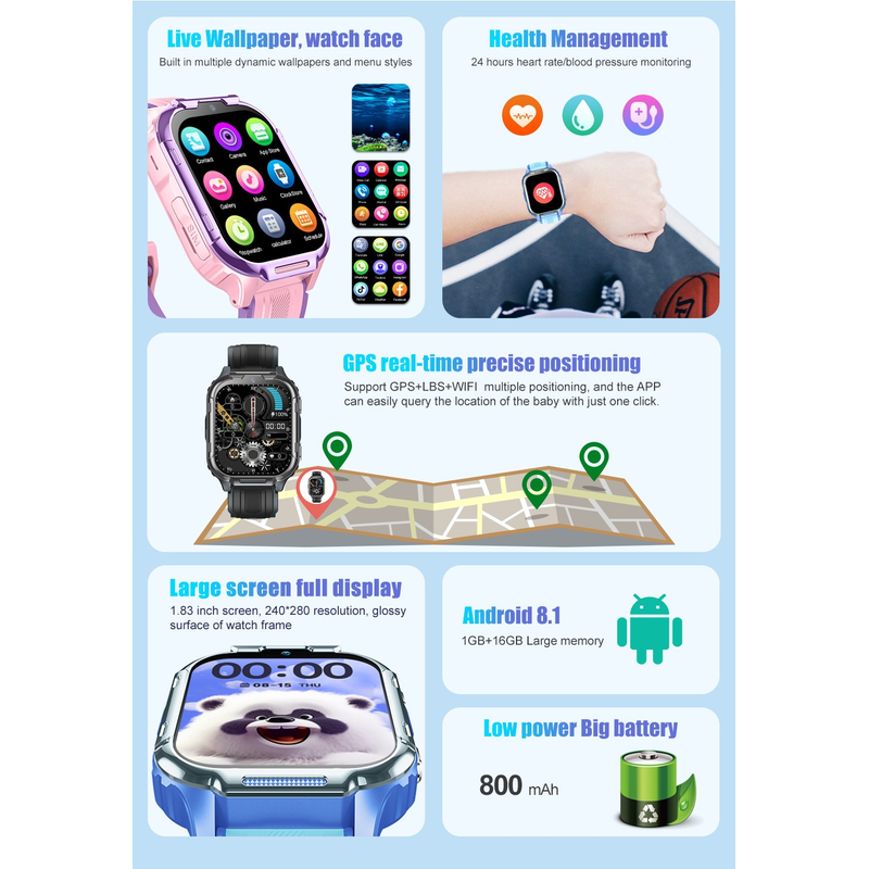 Keep your child safe, connected, and active with the latest 4G Kids Smart Watch — a full-featured GPS tracker watch for kids designed for modern families. With real-time location tracking, two-way video calling, SOS emergency alerts, and WiFi/LBS positioning, this smartwatch offers complete peace of mind whether your child is at school, outdoors, or on the go.