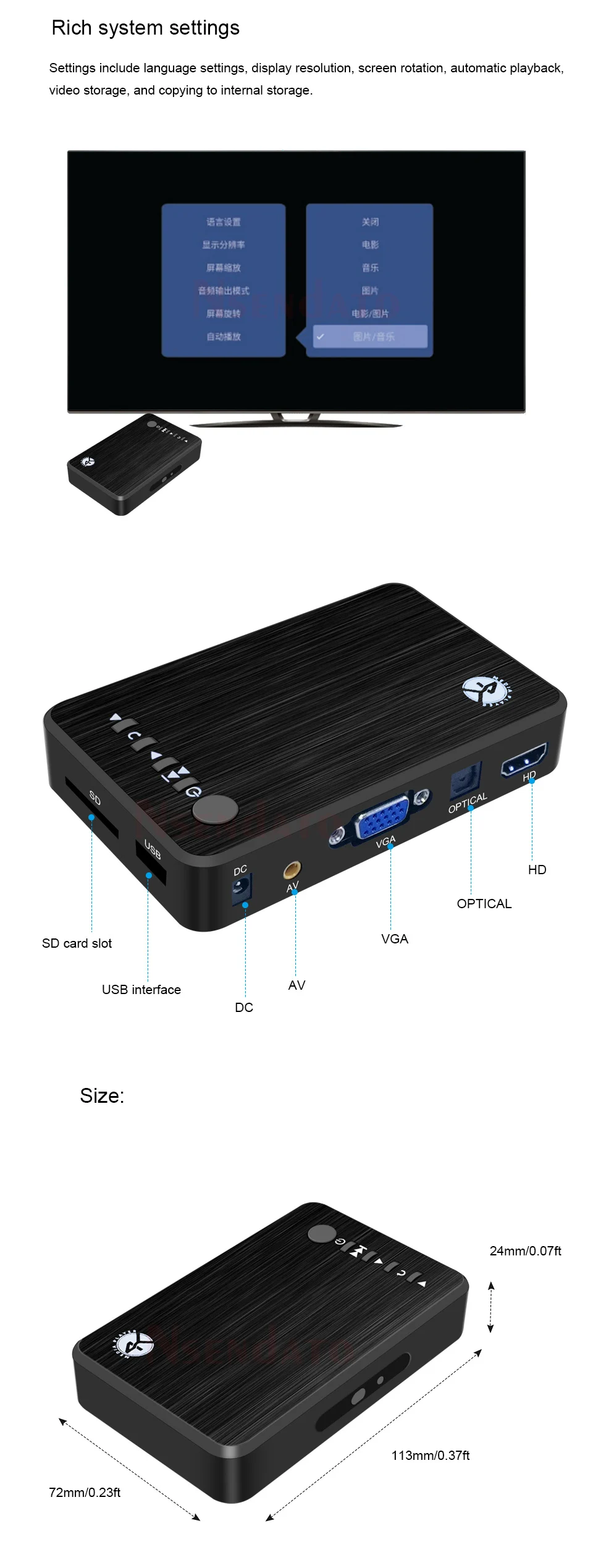 Audio Formats:Compatible-MP3, FLAC、APE、WAV、WMA, DTS, AAC、M4R、MKA、MP2、AMR, WV、M4A, AC3、AU、AIFF、 M4B.