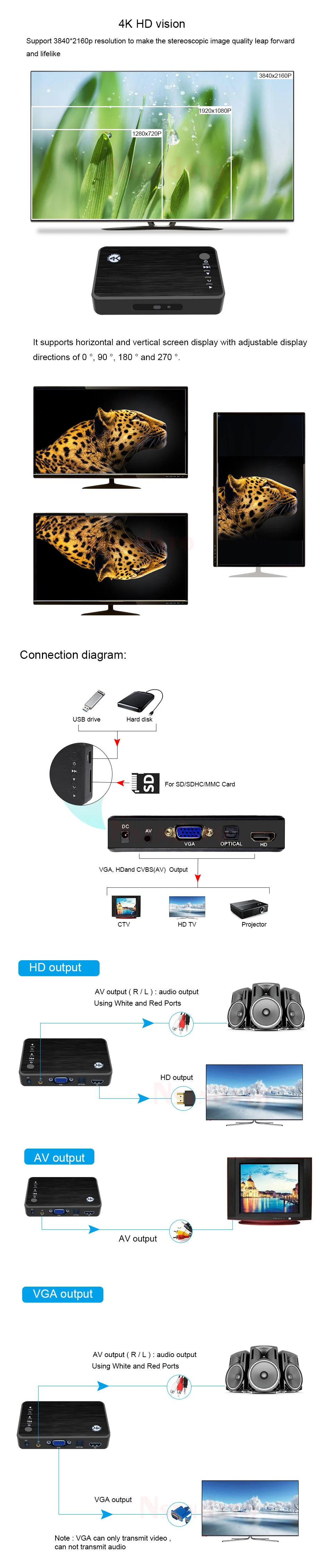 1,There is no 4K resolution option for connecting the TV or splicing screen: because the machine automatically detects and adapts to the TV resolution, if your TV is not 4K, the 4K option will not appear in the resolution option of the player.