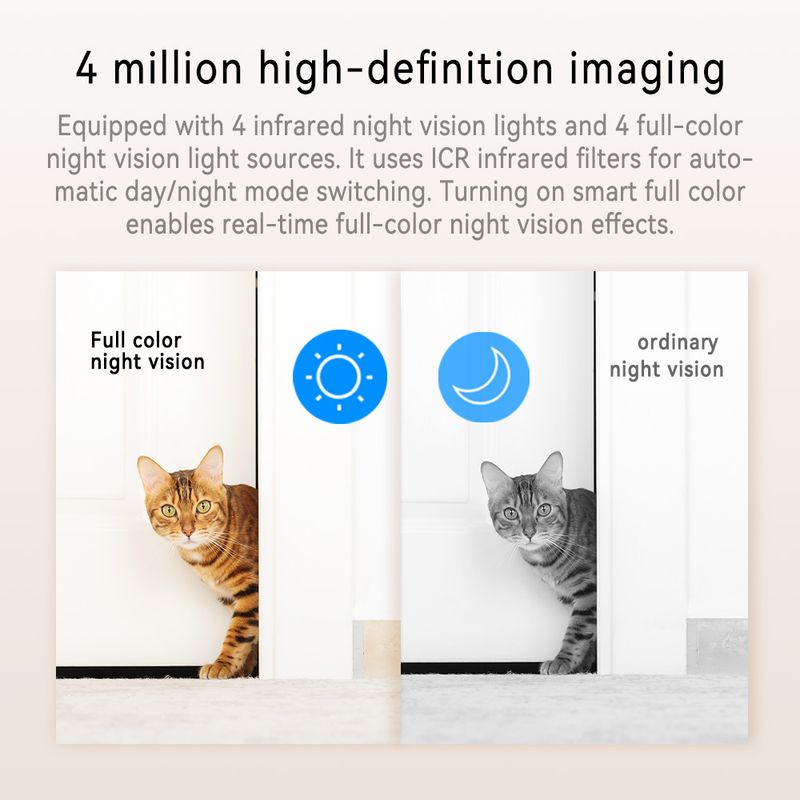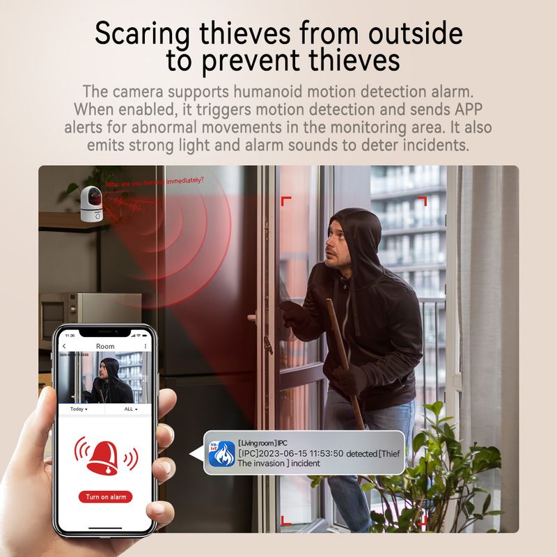 Integrated AI human shape detection, automatically capture and shoot suspicious movements status, real time push image warning message, greatly reduce the disturbance of other objects, such as the false alarm caused by small animals walking and light changes