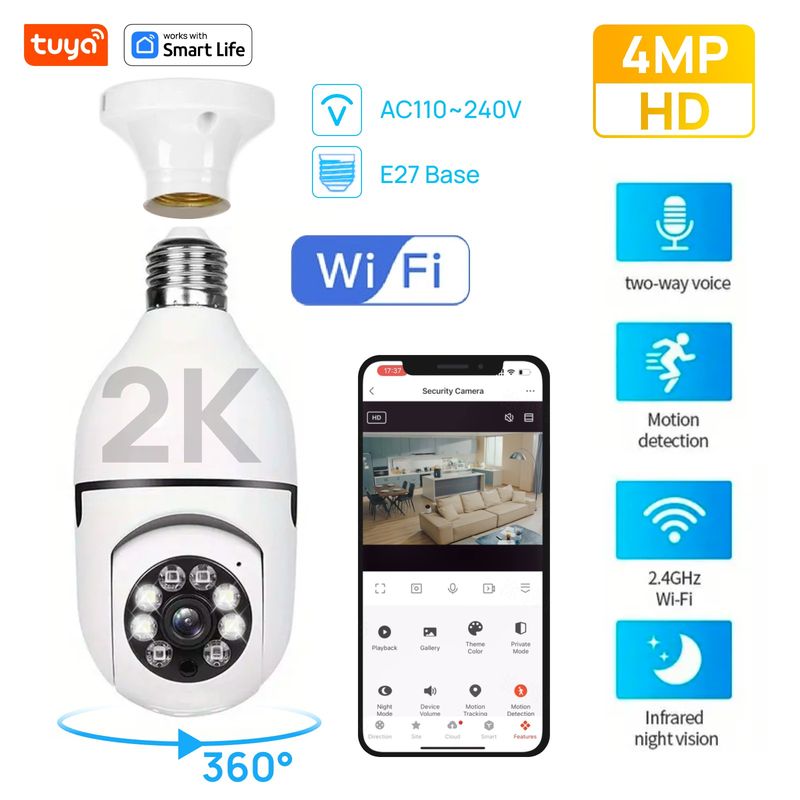 4MP Tuya Smart Home 2.4G E27 Bulb Wifi Surveillance Camera Night Security Video Surveillance Supprt Two Way Audio Mobile Motion