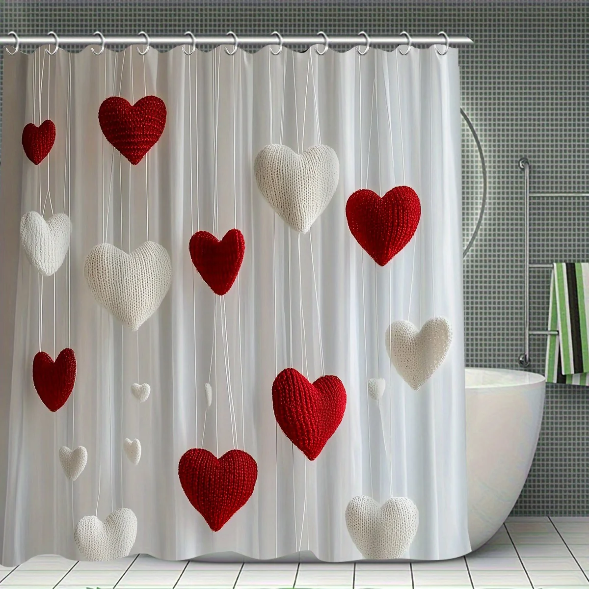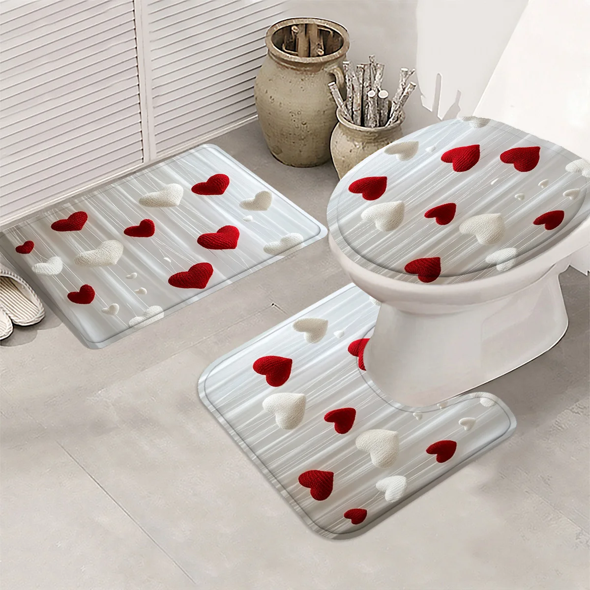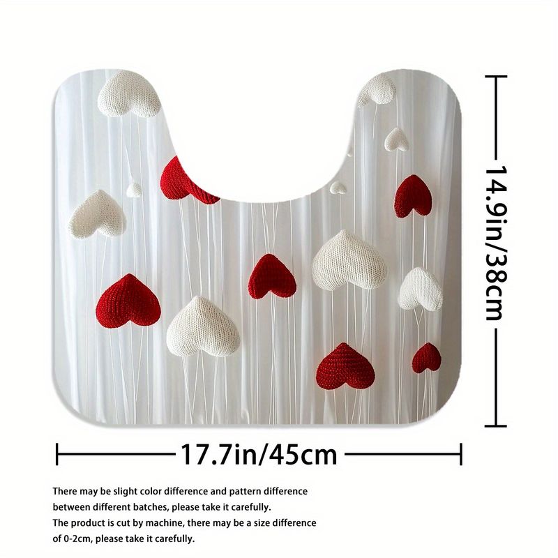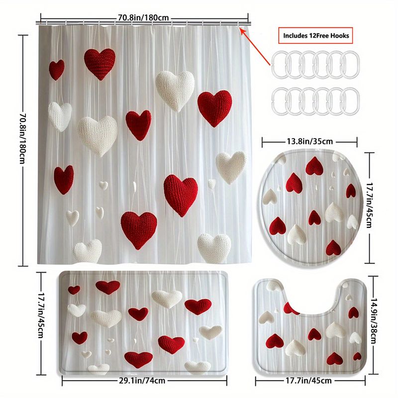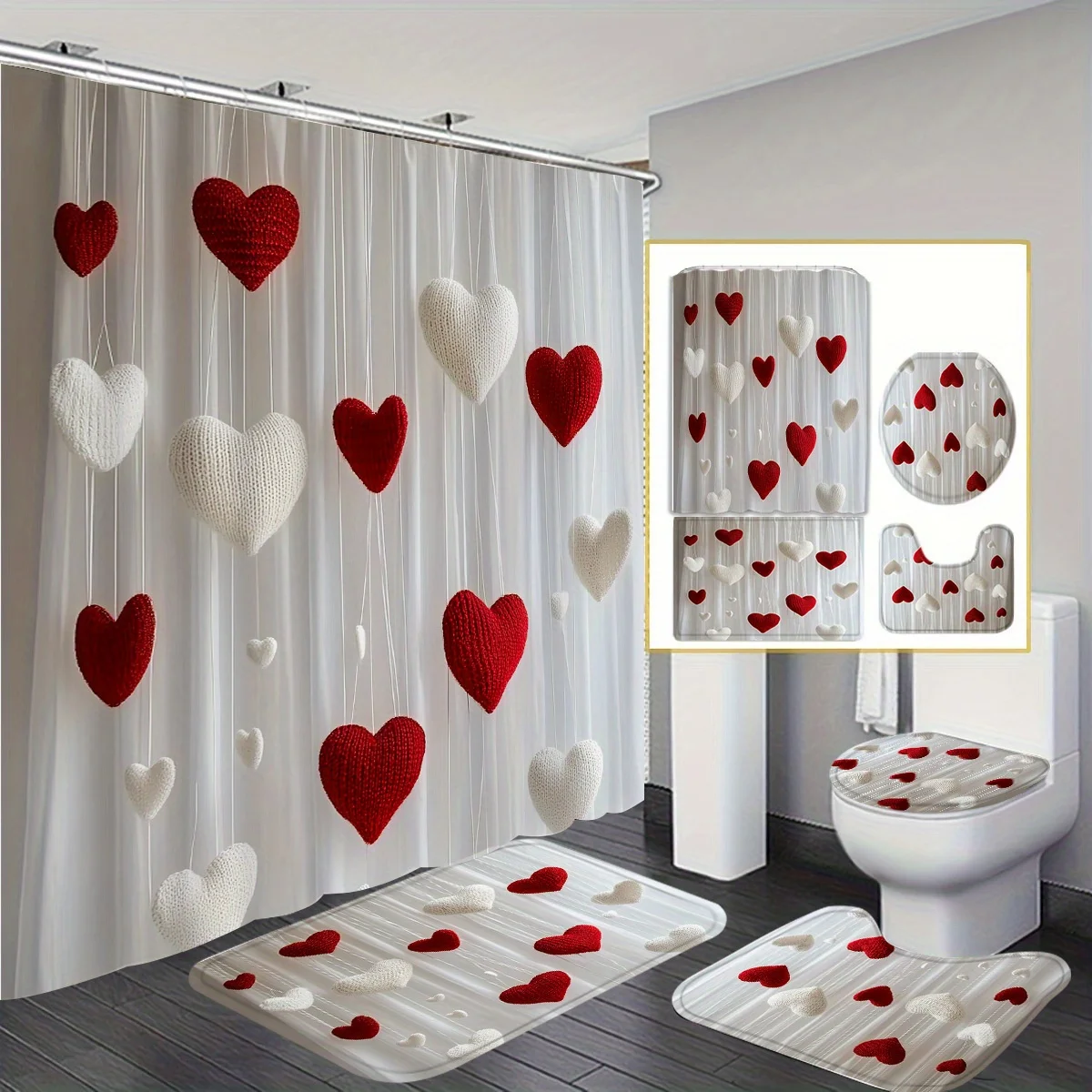 4pc Home Decor Heart-print bathroom decor, shower curtain with hooks, non-slip bathroom rug, U-shaped mat, toilet seat cover