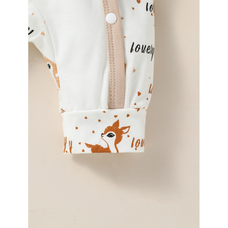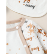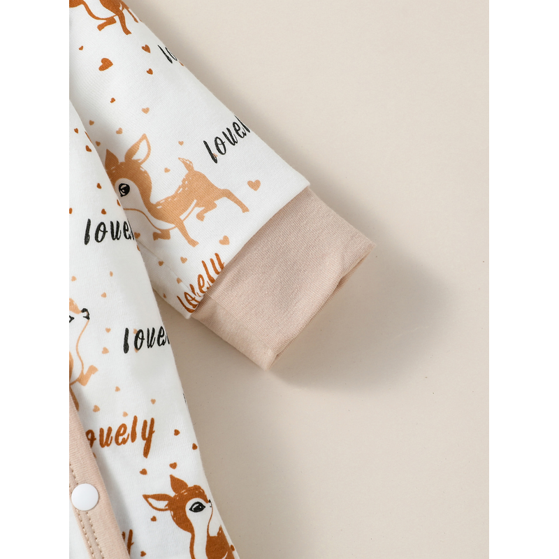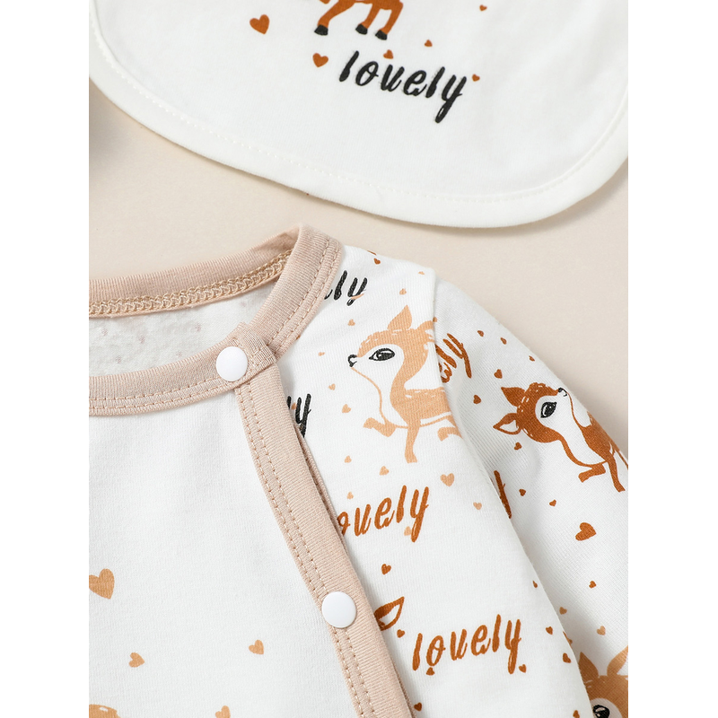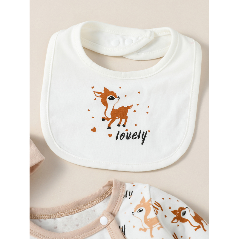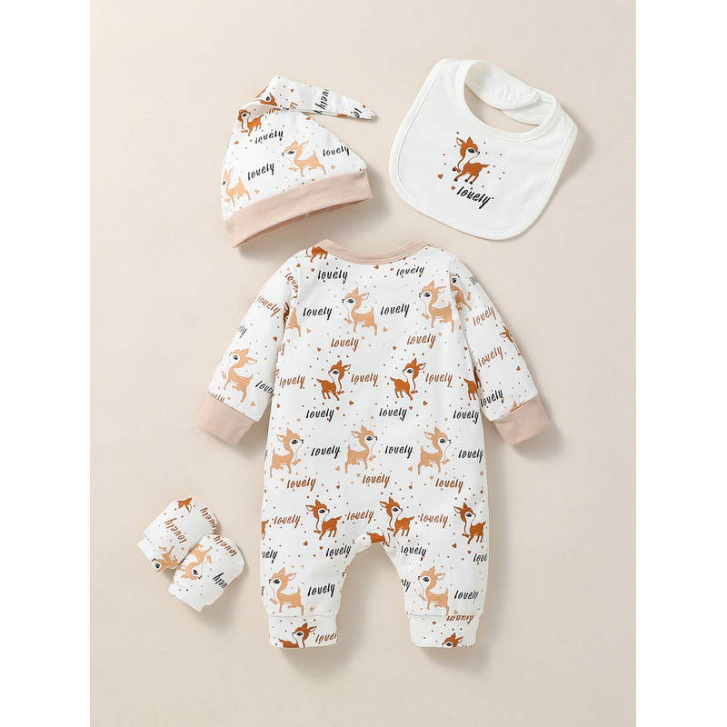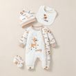 4PCS Baby unisex Long Sleeve Round Neck Animal Print With Button Casual Jumpsuit +Bib+Hat+Gloves