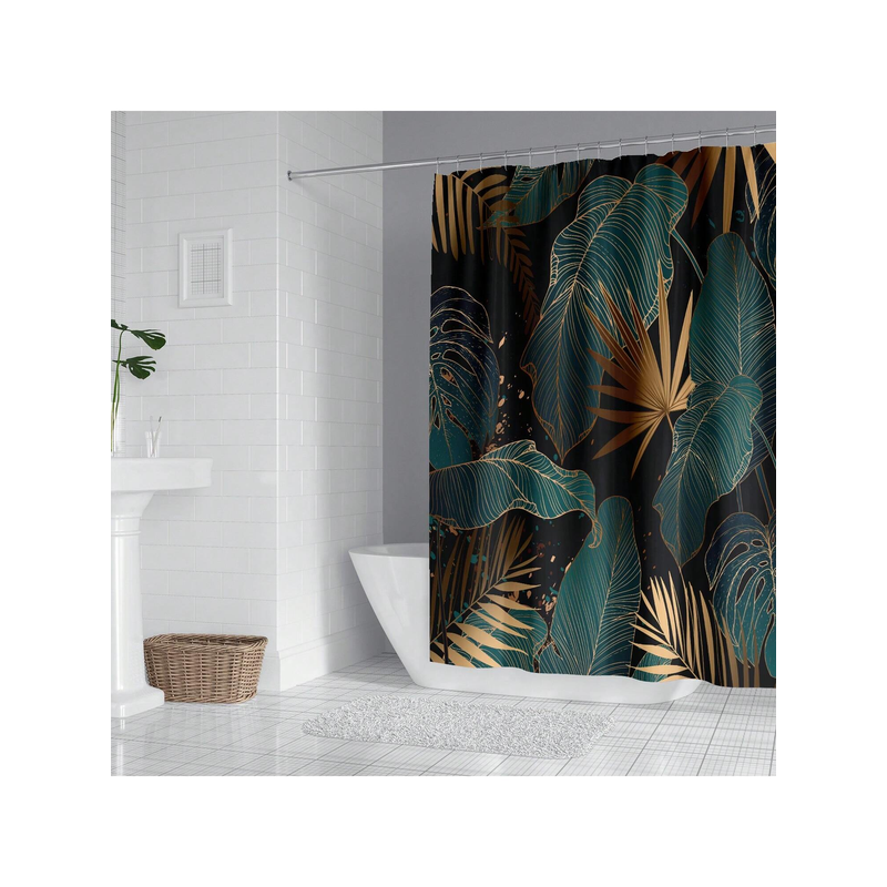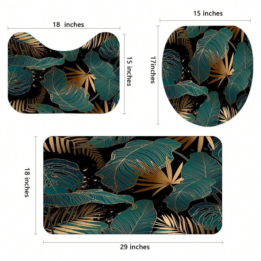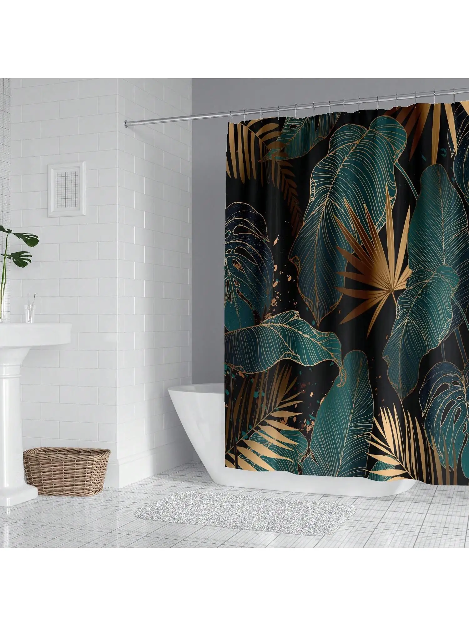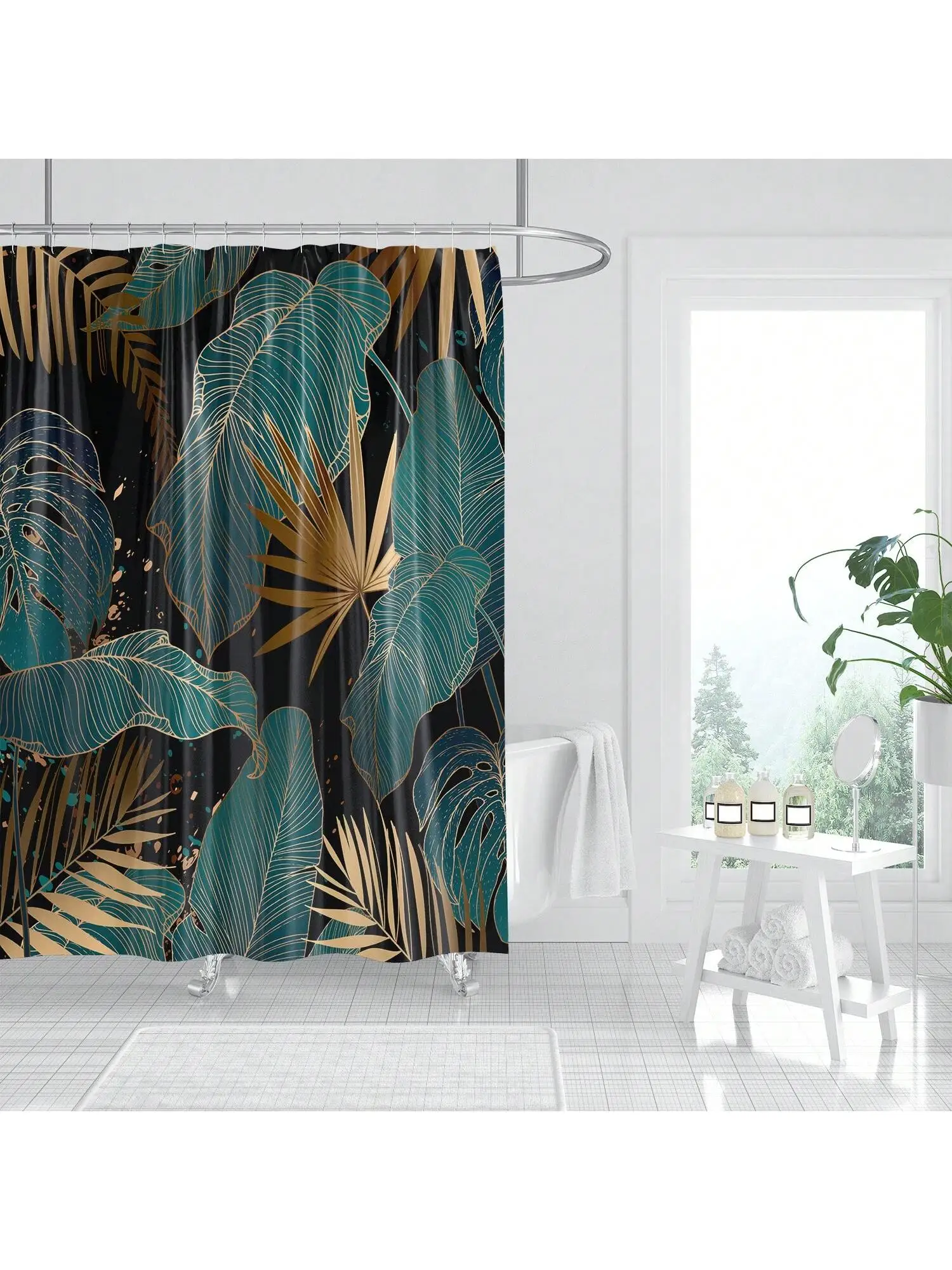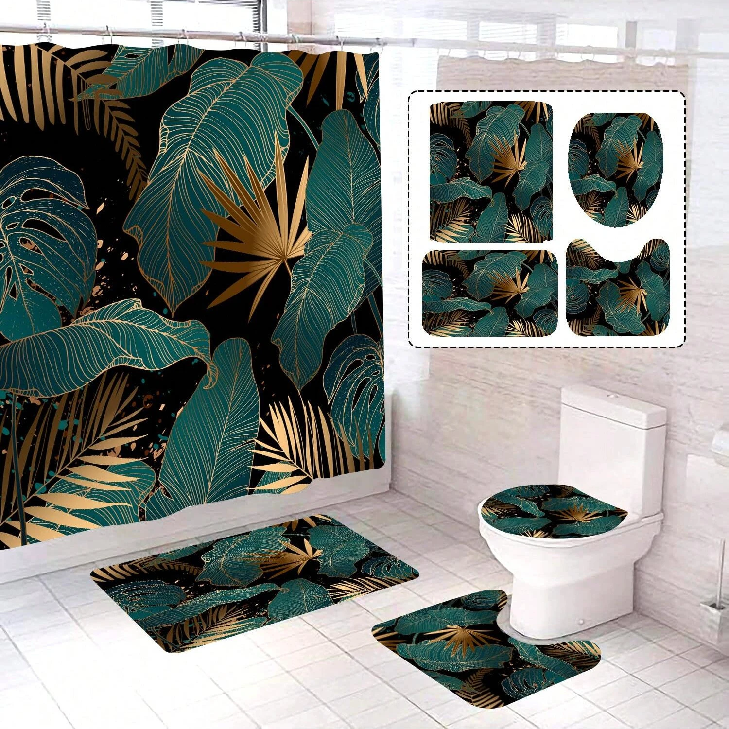 4pcs Emerald Green Shower Curtain Set,Palm Gold Leaves Green Leaves Plant Monstera For Bathroom Shower Curtains Big Bath Mat