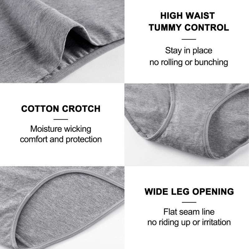1.FULL COVERAGE UNDERWEAR FOR WOMEN: These cotton panties provide full seat coverage,so no tugging to pull the legs down.The high rise underwear offers moderate tummy support,comfortable without non-pinching hip,reduces the appearance of muffin top with no rolling down or digging.Easy on and easy off undies.Work great with high waisted jeans.Suitable for giving to your female friends, mothers,and grandma.