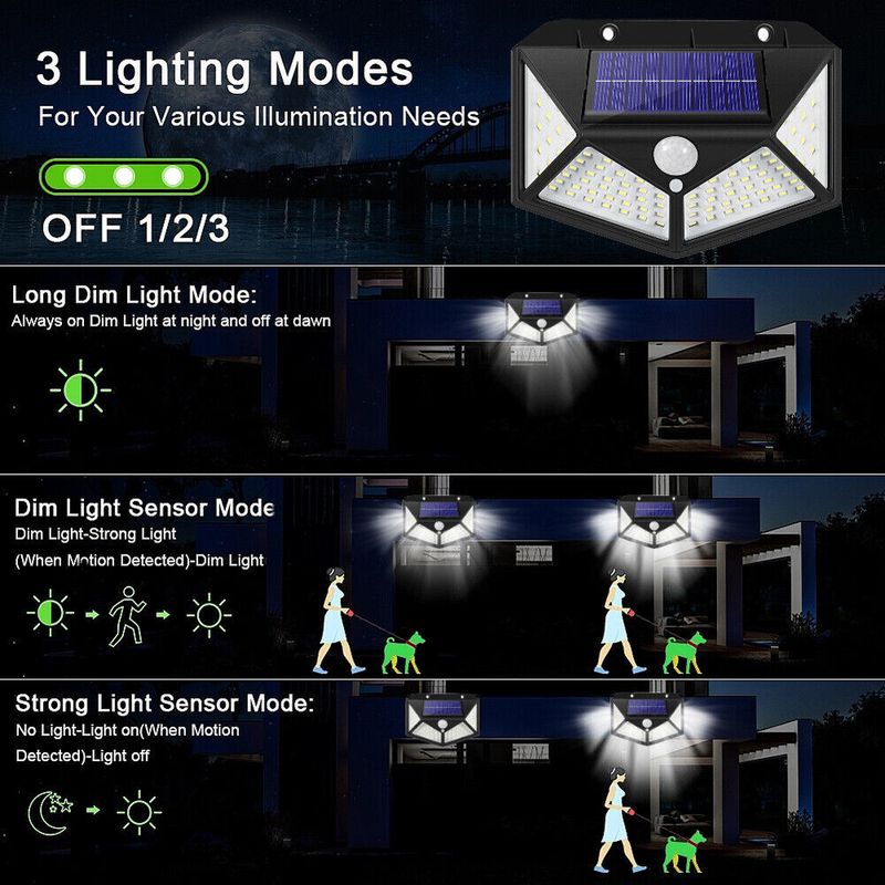 【100 LED SOLAR LIGHT】- Equipped with super bright 100 LEDs and 270° wide illumination angle, providing greater photometric coverage. The solar security light can illuminate your front door, backyard, garage, deck, garden, fence, driveway and stairs. Keep your family and pets safe on dark nights.
