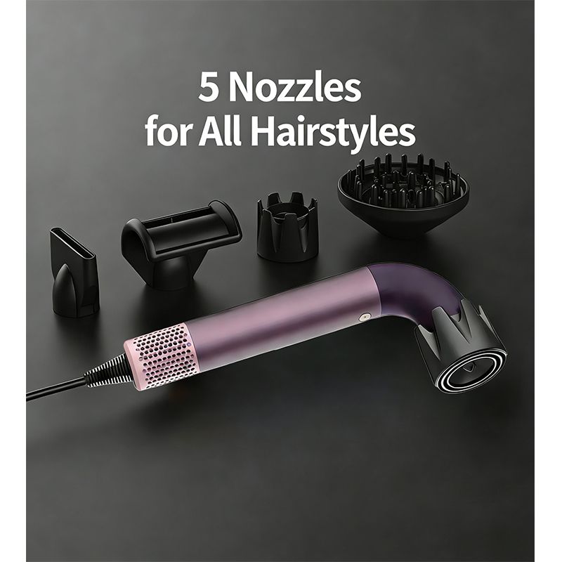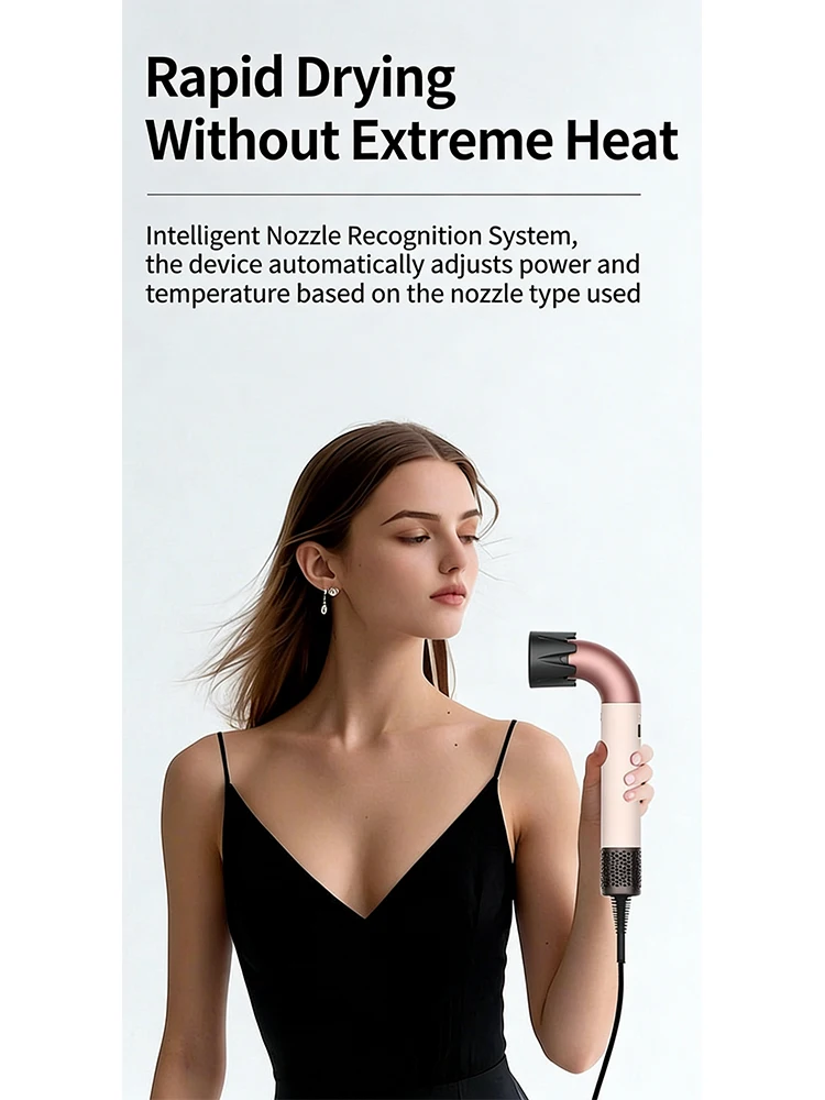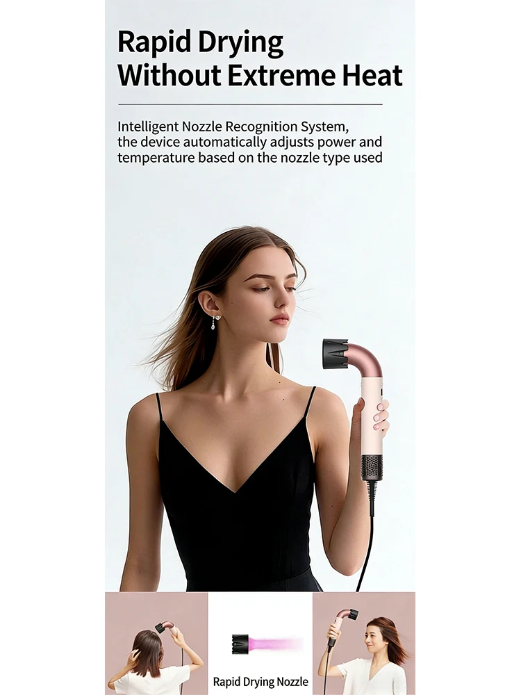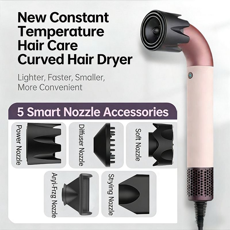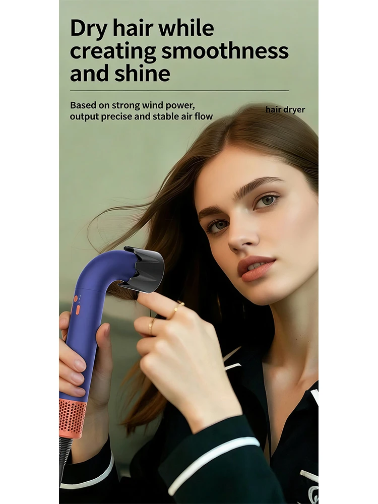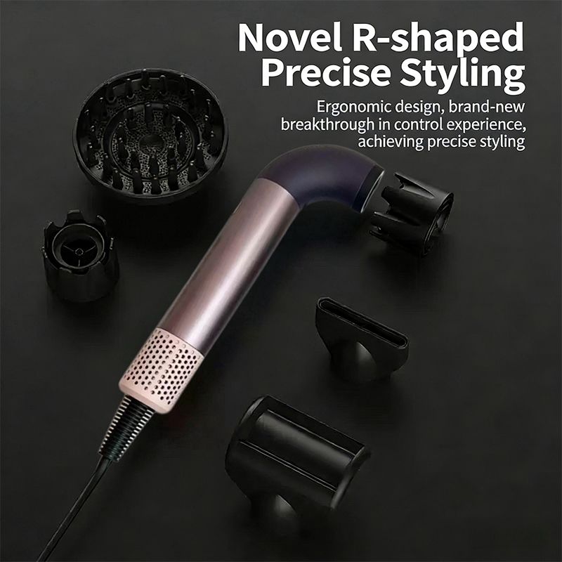 Design features: The tube of the "r" hair dryer is curved, and the high-speed hair dryer has an "r"-shaped tube. This design makes the hair dryer more in line with usage habits, facilitating user operation. When drying bangs and hair roots, it can easily reach tricky angles without the need to struggle to find the right angle.