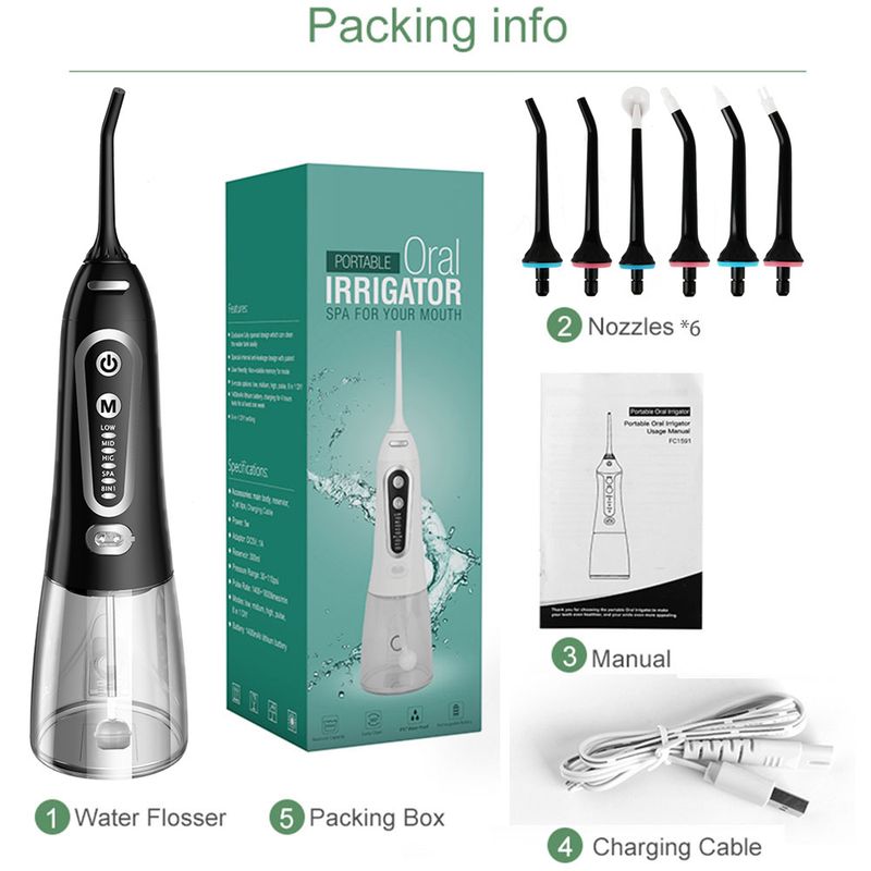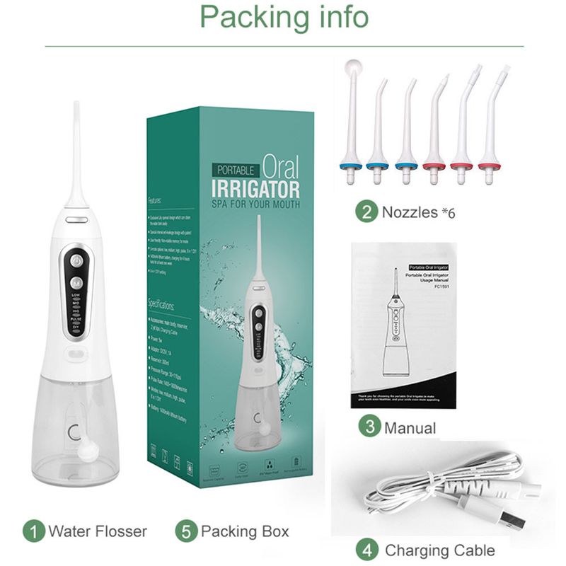 Teeth flusher*1, nozzle*6, charging cable*1, English manual*1, English color box*1
