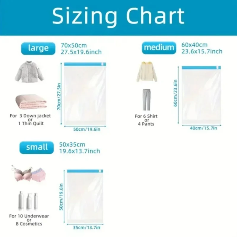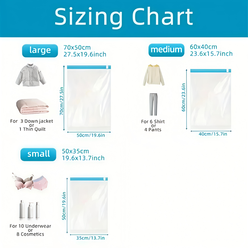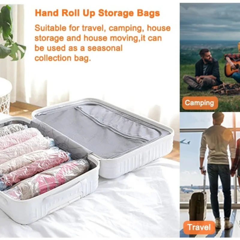 Simple Operation: No vacuum or pump needed , the operation is simple, it can increases up to 75% of the storage space for the clothes in the suitcase or backpack.