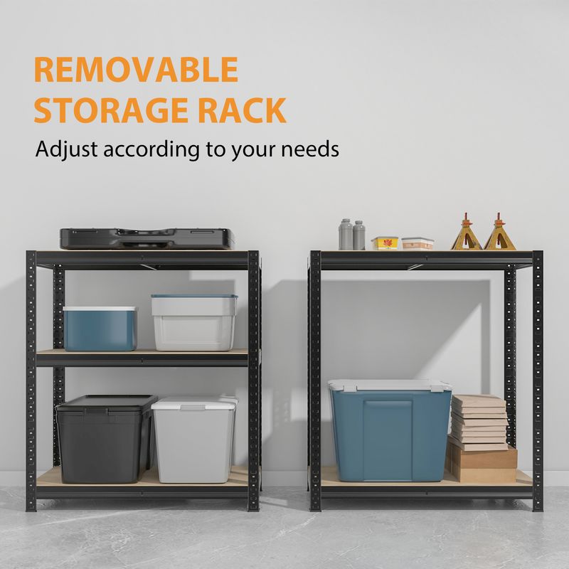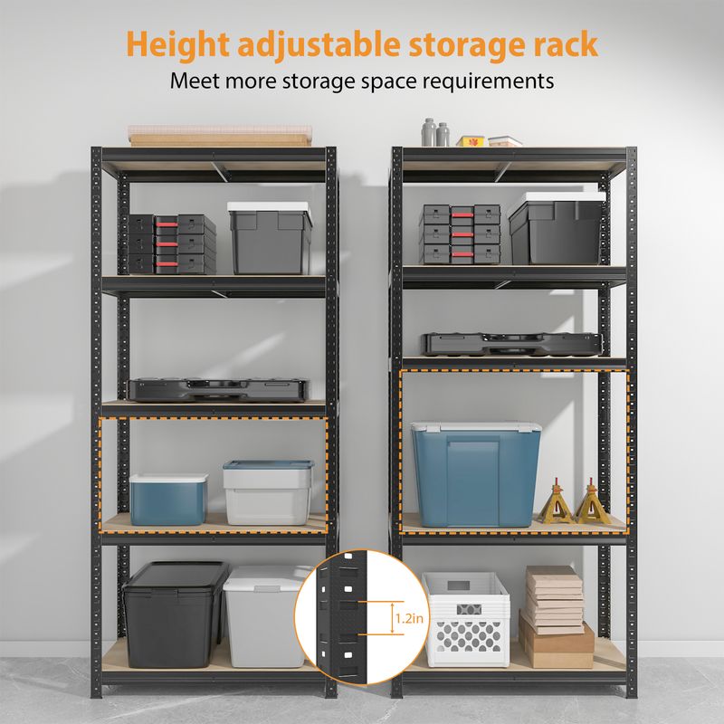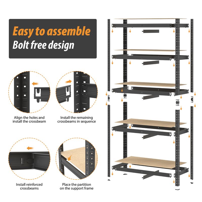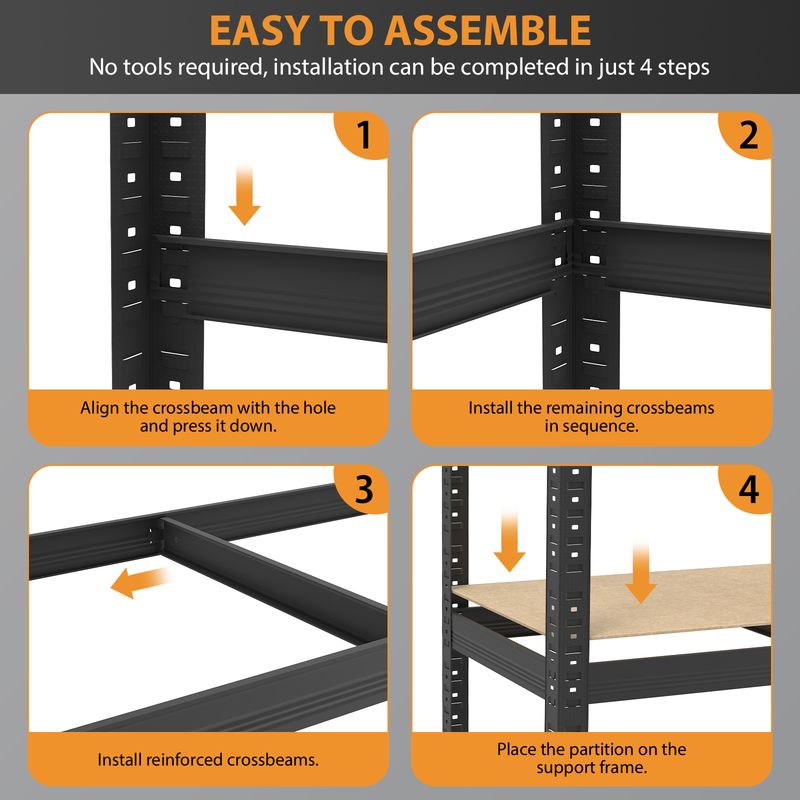 Heavy duty 5 tier shelves are perfect for storage and organization stock in garage, shed, utility room, warehouse, workshop, shops and kitchens. This racking unit is made from metal steel, sturdy and durable. Each bay is made with moisture-resistant MDF to eliminate board sag and has a rust-resistant coating to keep your shelves in tip-top condition for years to come!