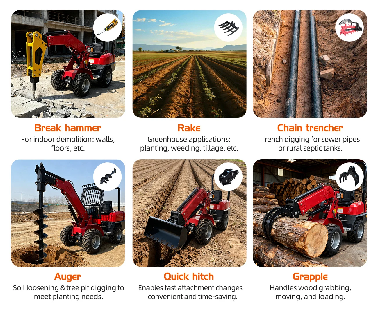 A: Mini excavators are champions of efficiency and versatility. Their compact size allows them to work in tight spaces—like urban backyards, inside buildings, or dense orchards—where larger machines cannot operate. They are designed with rubber tracks to prevent damage to finished surfaces like roads or floors. Most importantly, they significantly boost productivity; one mini excavator can do the work of approximately 15 laborers, drastically reducing project time and labor costs. With the ability to use various attachments (e.g., breakers, augers, grapples), they become multi-functional tools for countless tasks.