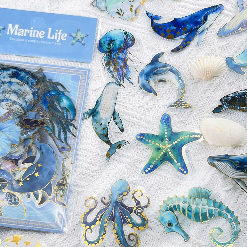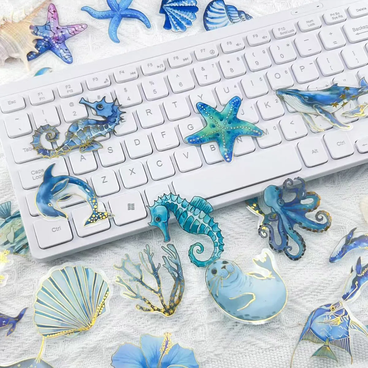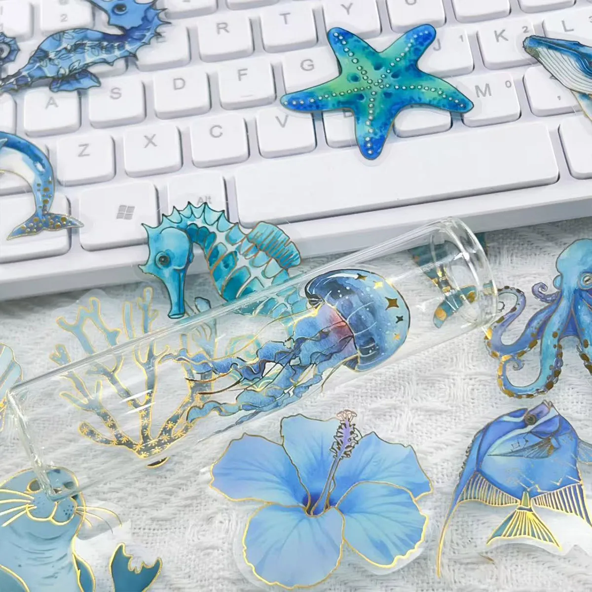 50 Cartoon Gold Foil Sea Creature Stickers Pack, Waterproof Transparent Pet for Journal Decoration, Guitar, Notebook