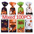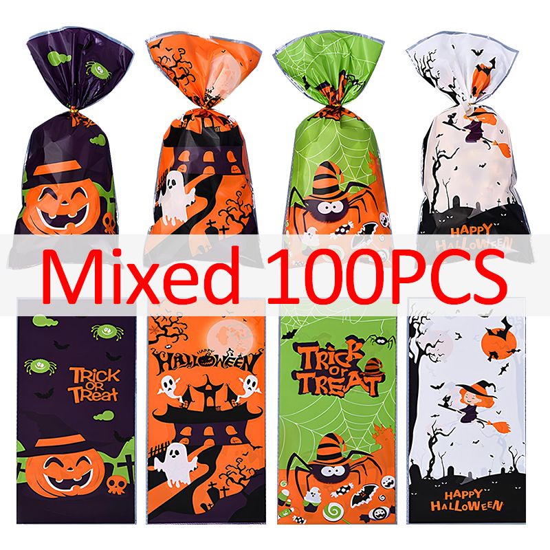 50/100PCS Treat Bags Pumpkin Ghost Bat Plastic Candy Bags with Twist Ties Halloween Party DIY Decoration Gift Packaging Bags ZYF