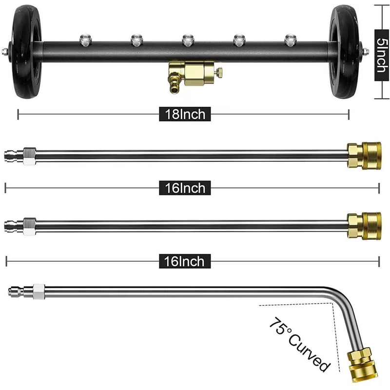 • INCLUDE:Pressure Washer Undercarriage Cleaner, 1-piece 16 inch angled extension wand and 1-pieces 16 inch straight extension wand. All parts have 1/4 inch Quick Connect.