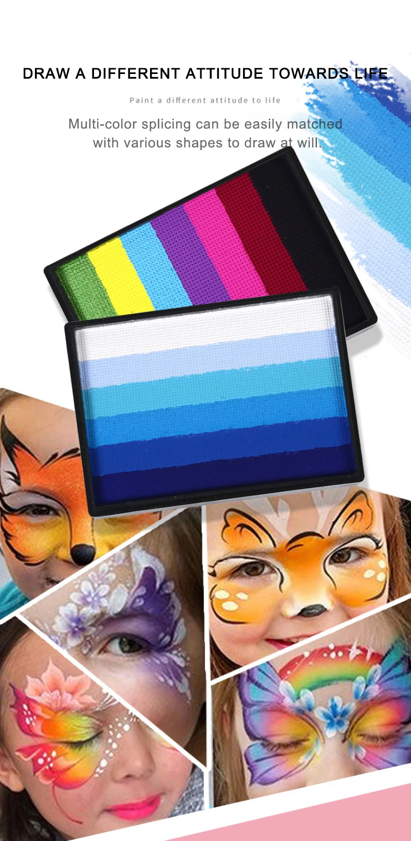 3. DIY painting: Use this face painting to complete any costume, whether it is a clown face, animal face, mustache, artistic body painting, etc. The colors can be easily mixed together to obtain a variety of effects.