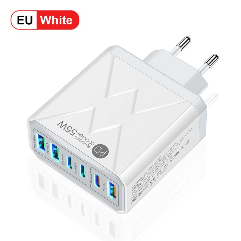 1. This 55W fast charger is equipped with 6 charging ports, including 3 USB ports and 3 PD (Power Delivery) ports, providing charging services for a variety of mobile phones.