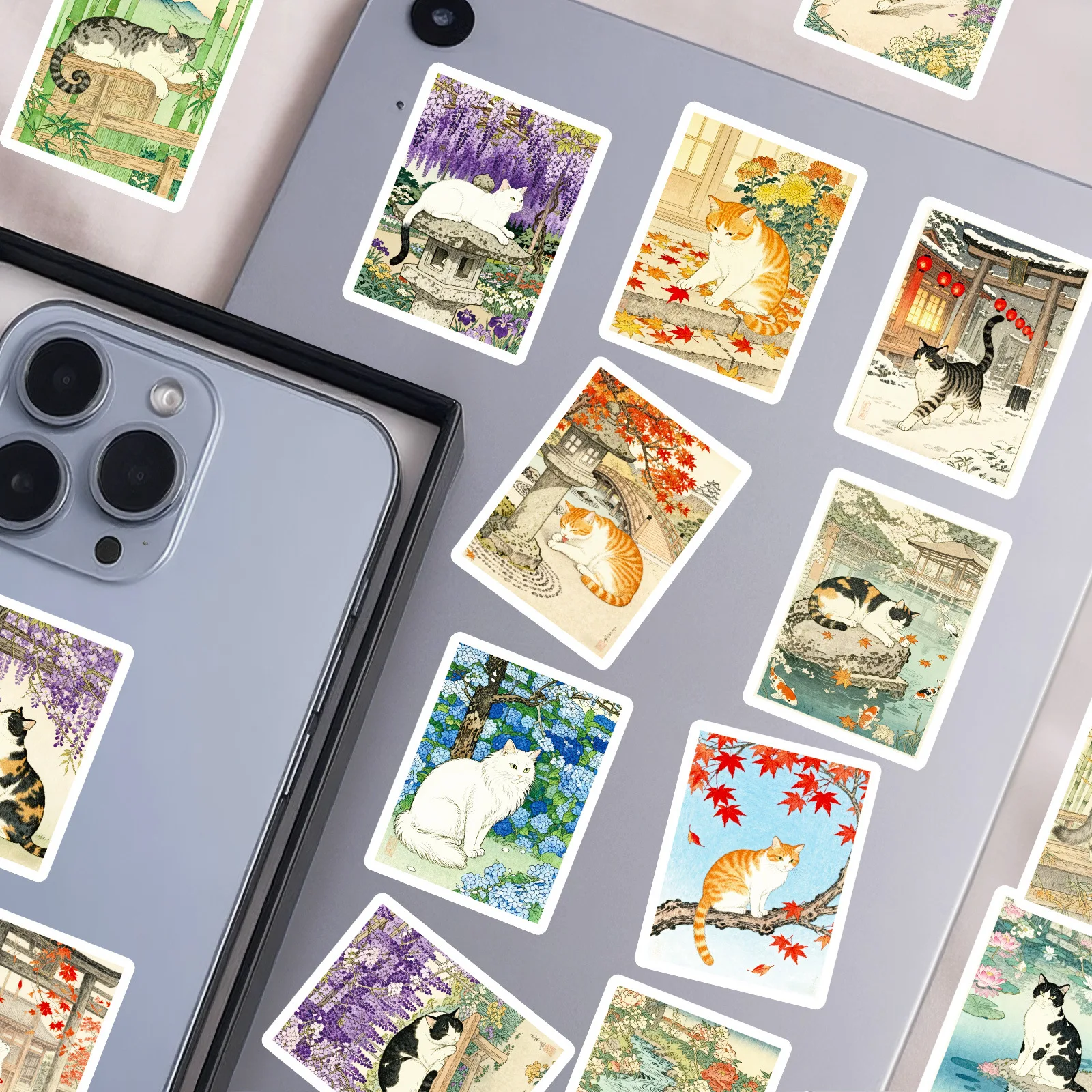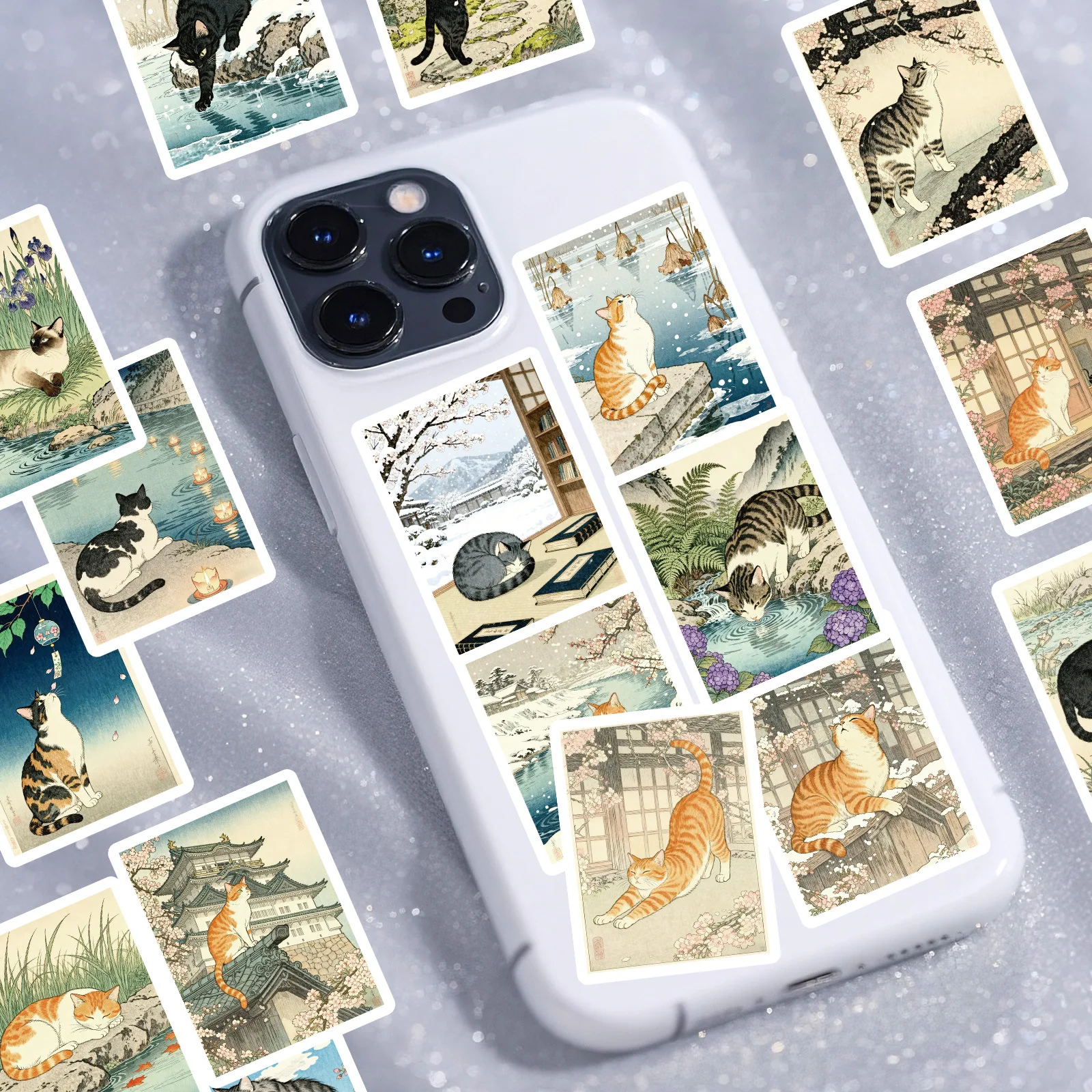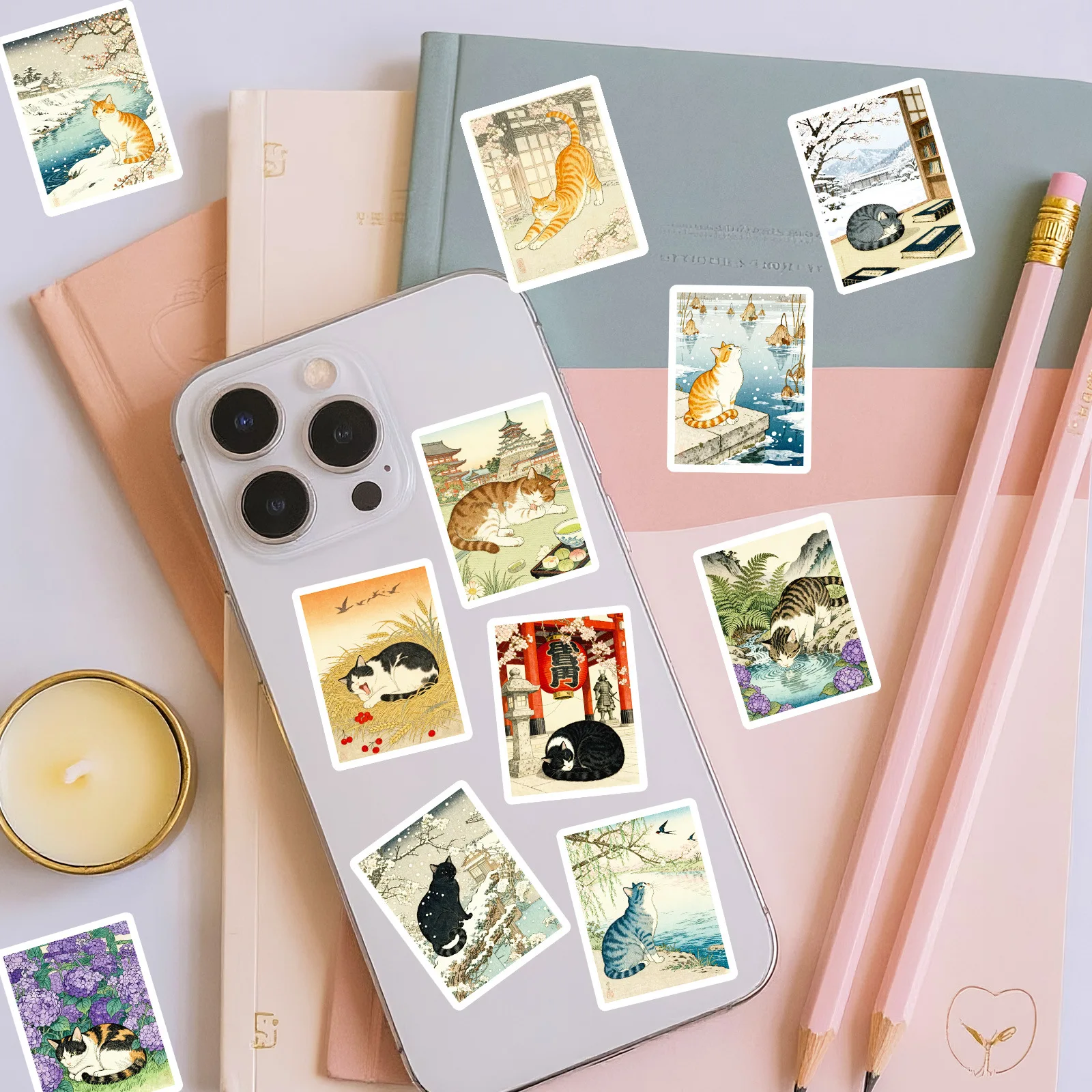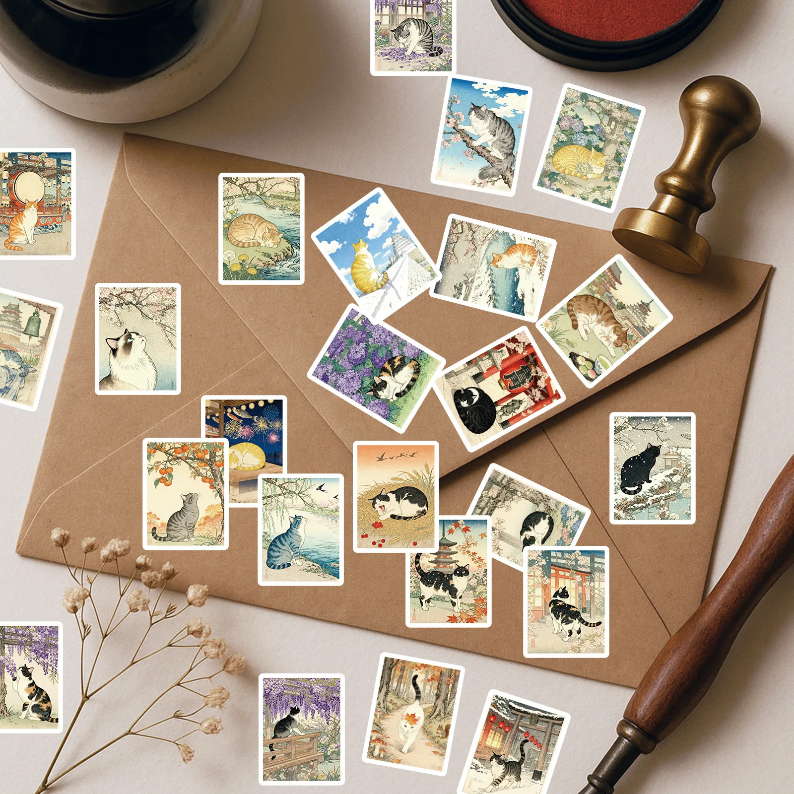56/112 Pcs Japanese Retro Hand Drawn Cat Theme Stickers for Stationery Box Notebook Phone Laptop Printer Cup No Repeat Decals