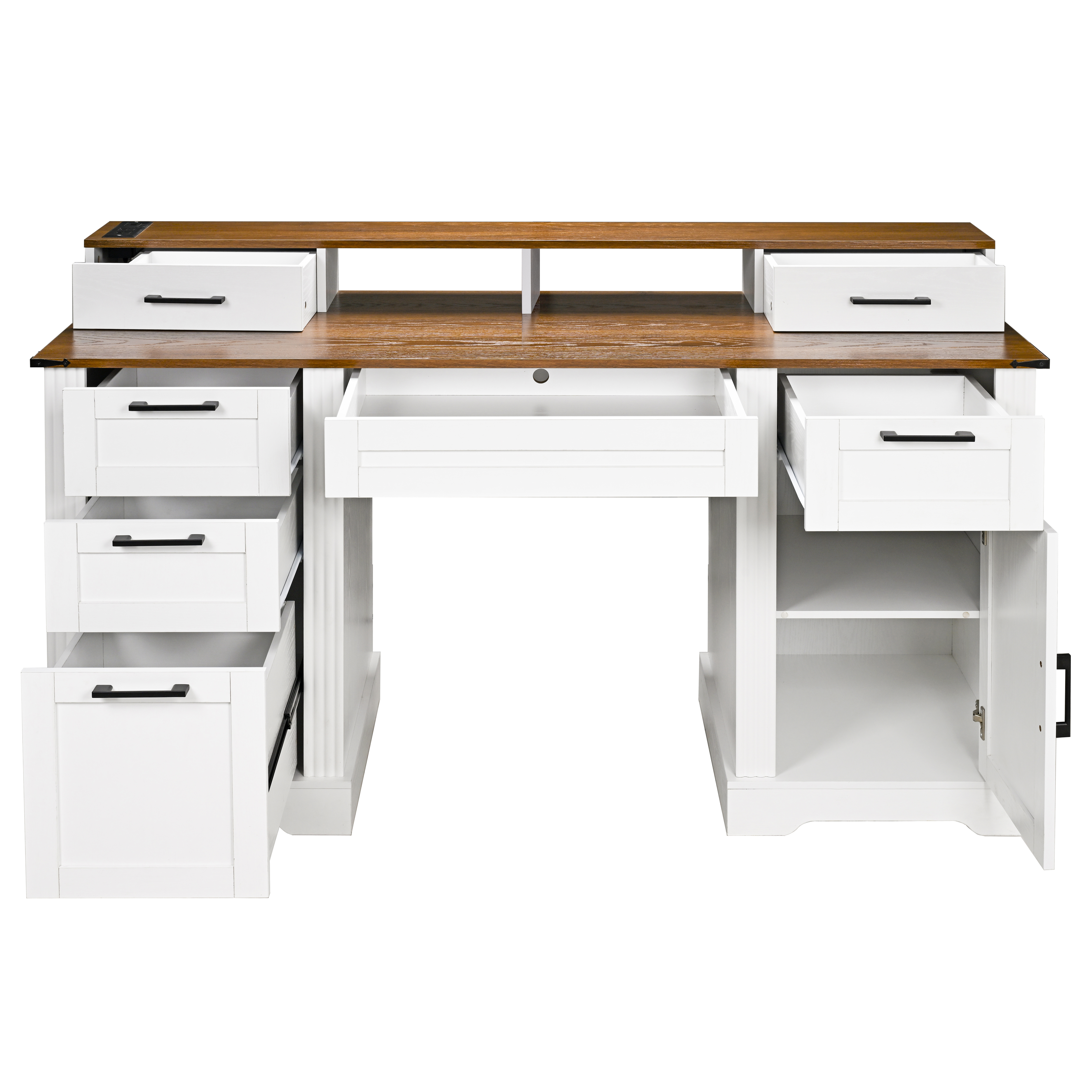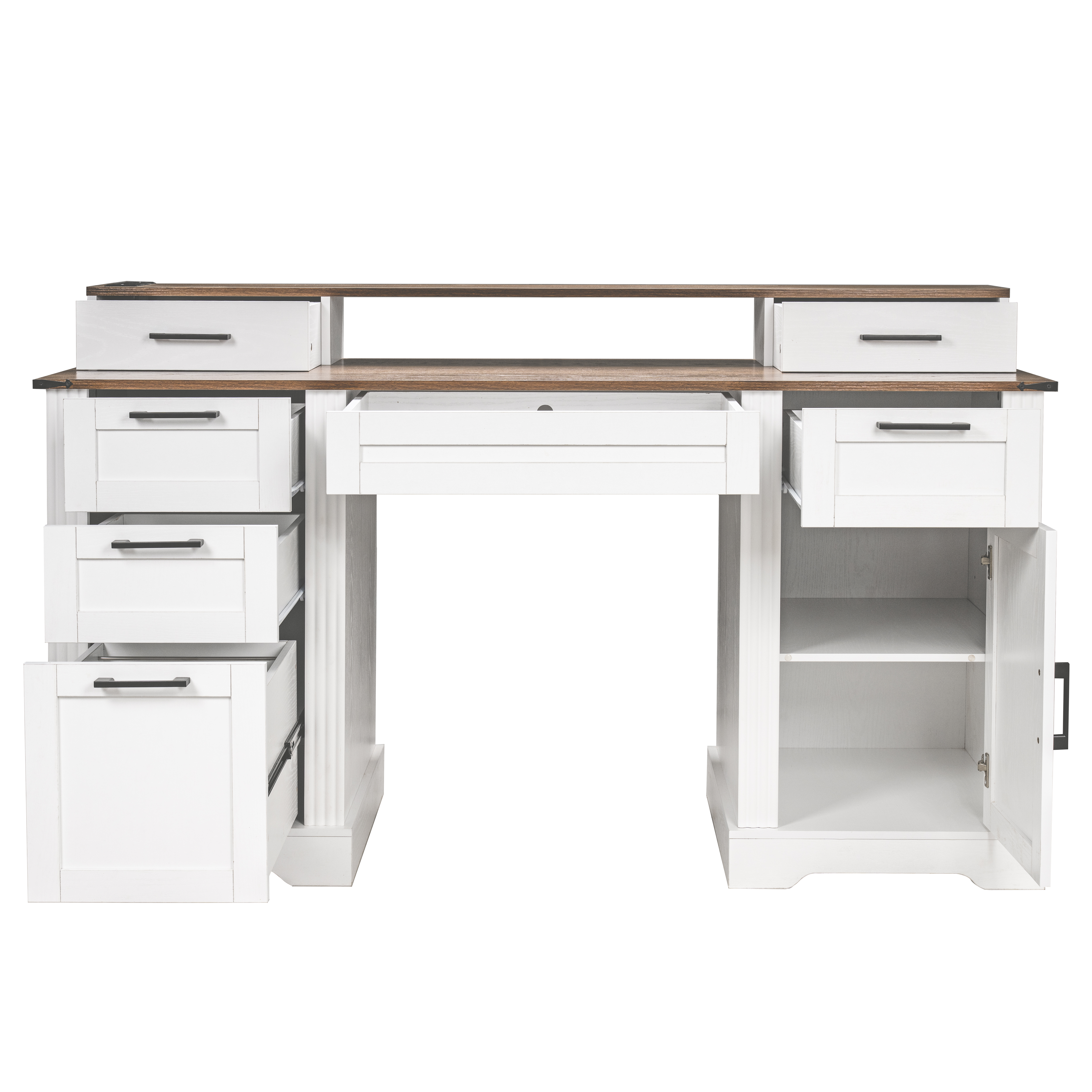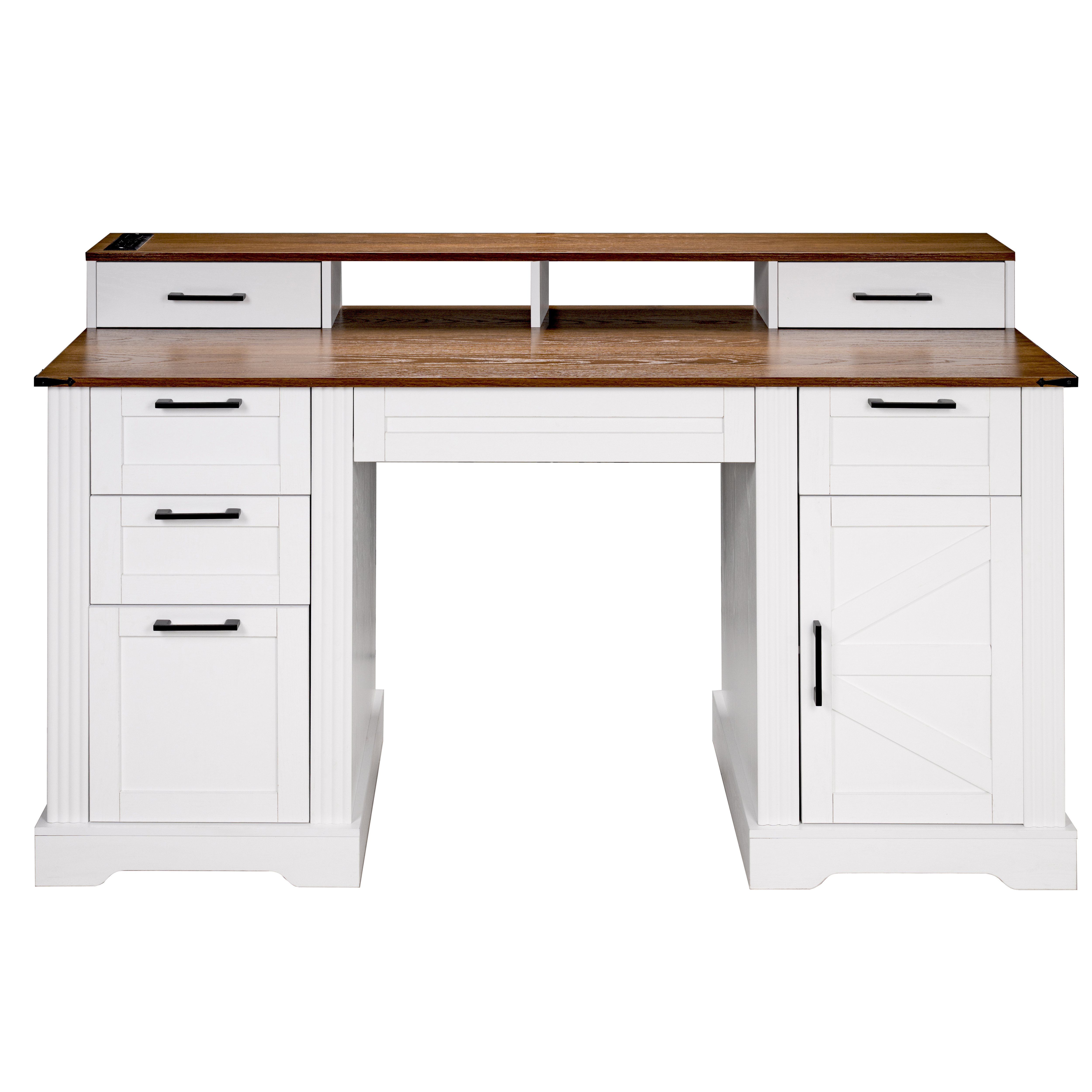 Product Name:59" Farmhouse Office Desk With Charging Station & Storage Cabinet, Barn Door Design Home Office Study Desk with File Drawer, Monitor Stand and Keyboard Tray for Office, Study, Living Room, White