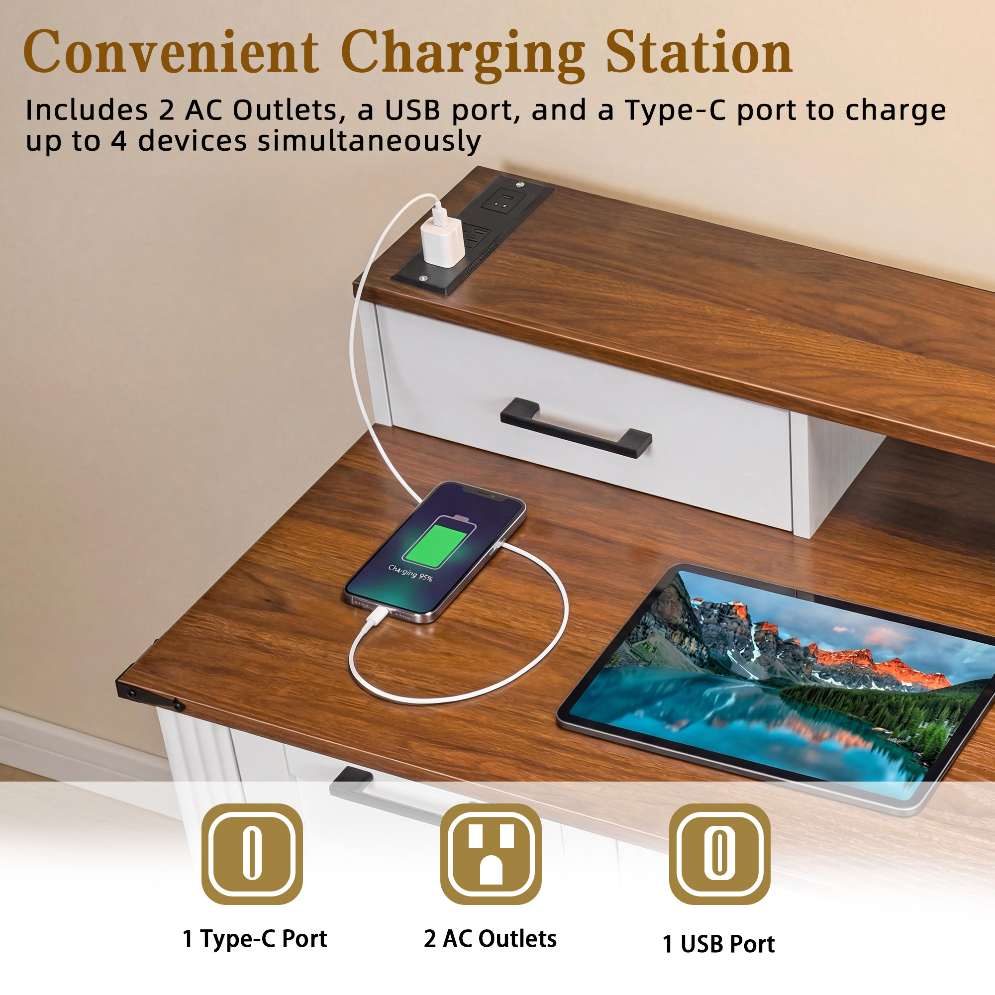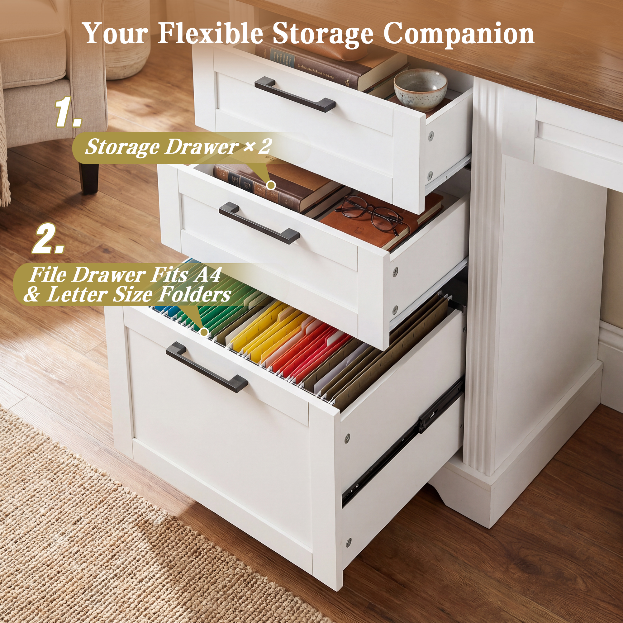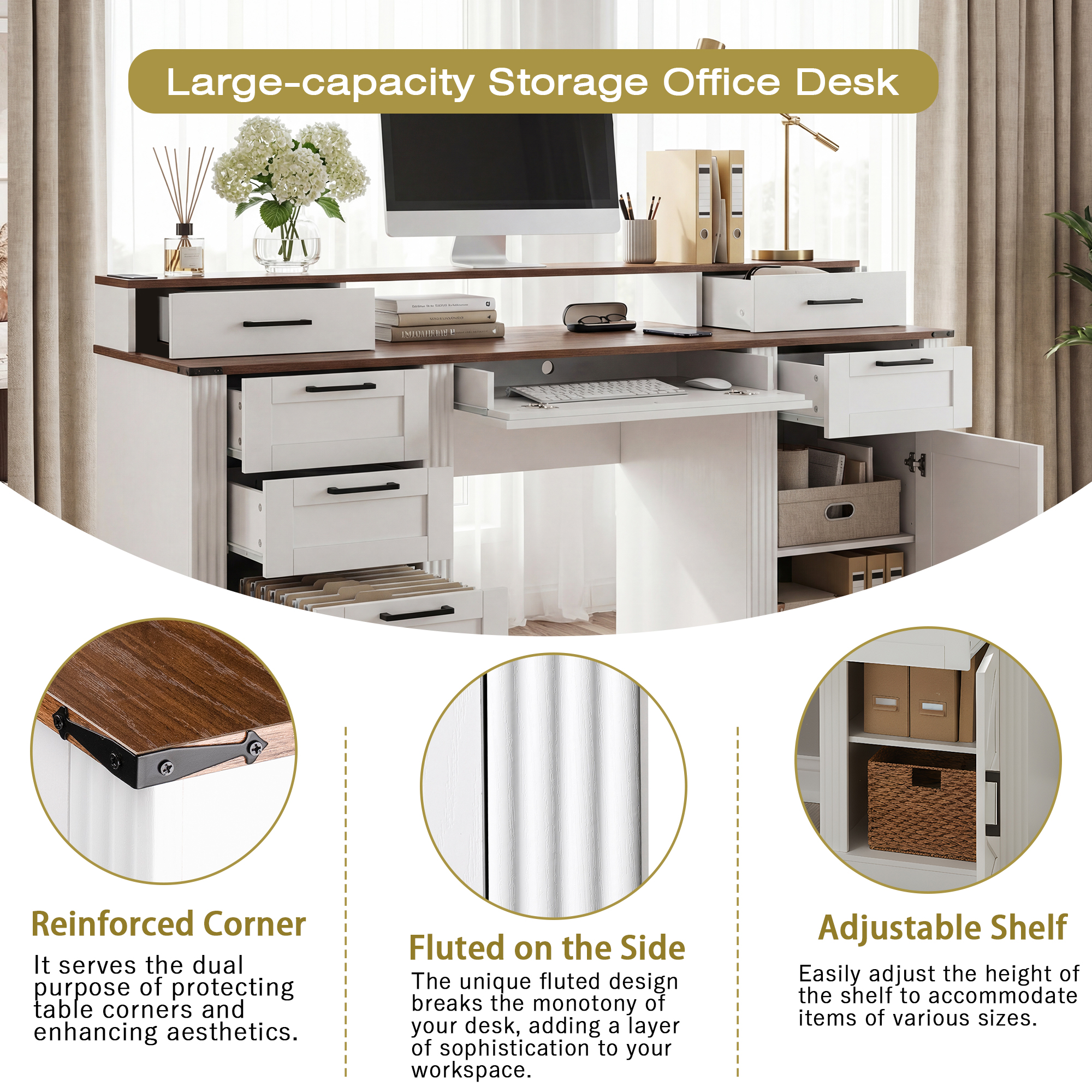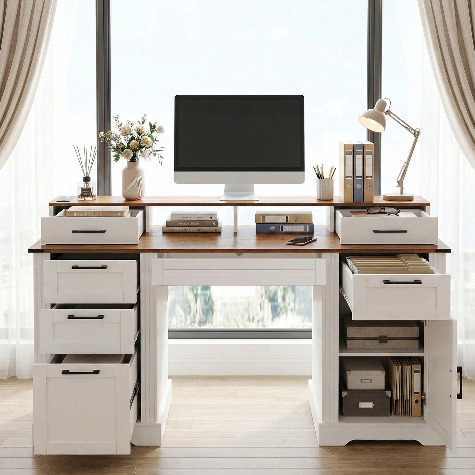 Product Name:59" Farmhouse Office Desk With Charging Station & Storage Cabinet, Barn Door Design Home Office Study Desk with File Drawer, Monitor Stand and Keyboard Tray for Office, Study, Living Room, White