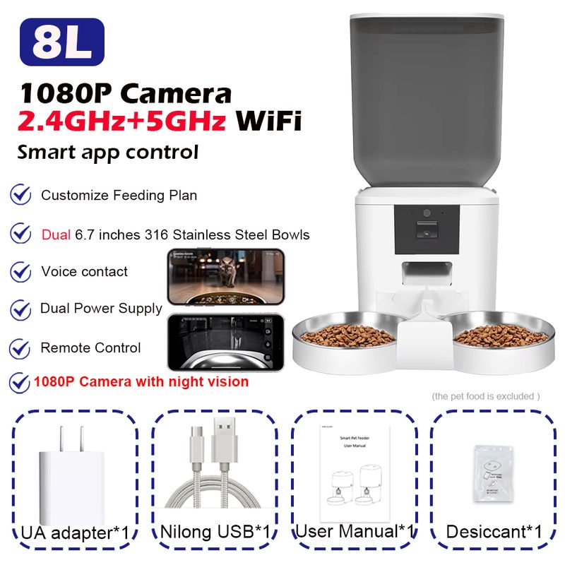 8L WiFi Smart Pet Feeder With 1080P Camera Video 5GWIFI Cat Food Dispenser Pet Smart Voice Recorder Remote Control Auto Feeder For Cat Dog