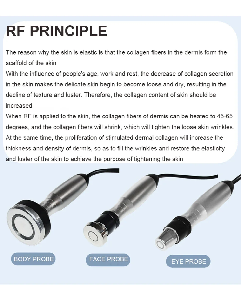 Technically speaking, radiofrequency is a kind of electromagnetic spectrum. It is a high frequency andalternating electromagnetic wave. When RF acts on the skin, it will make the collagen of dermal fibersheated to 45 °C -65 °C. Then the collagen fiber will shrink in a short time which can tighten the flabbyskin and stimulate the collagen to grow. By this, RF energy will prompt the dermis layer to be firm andelastic. That is, to tighten the skin and remove the wrinkle.