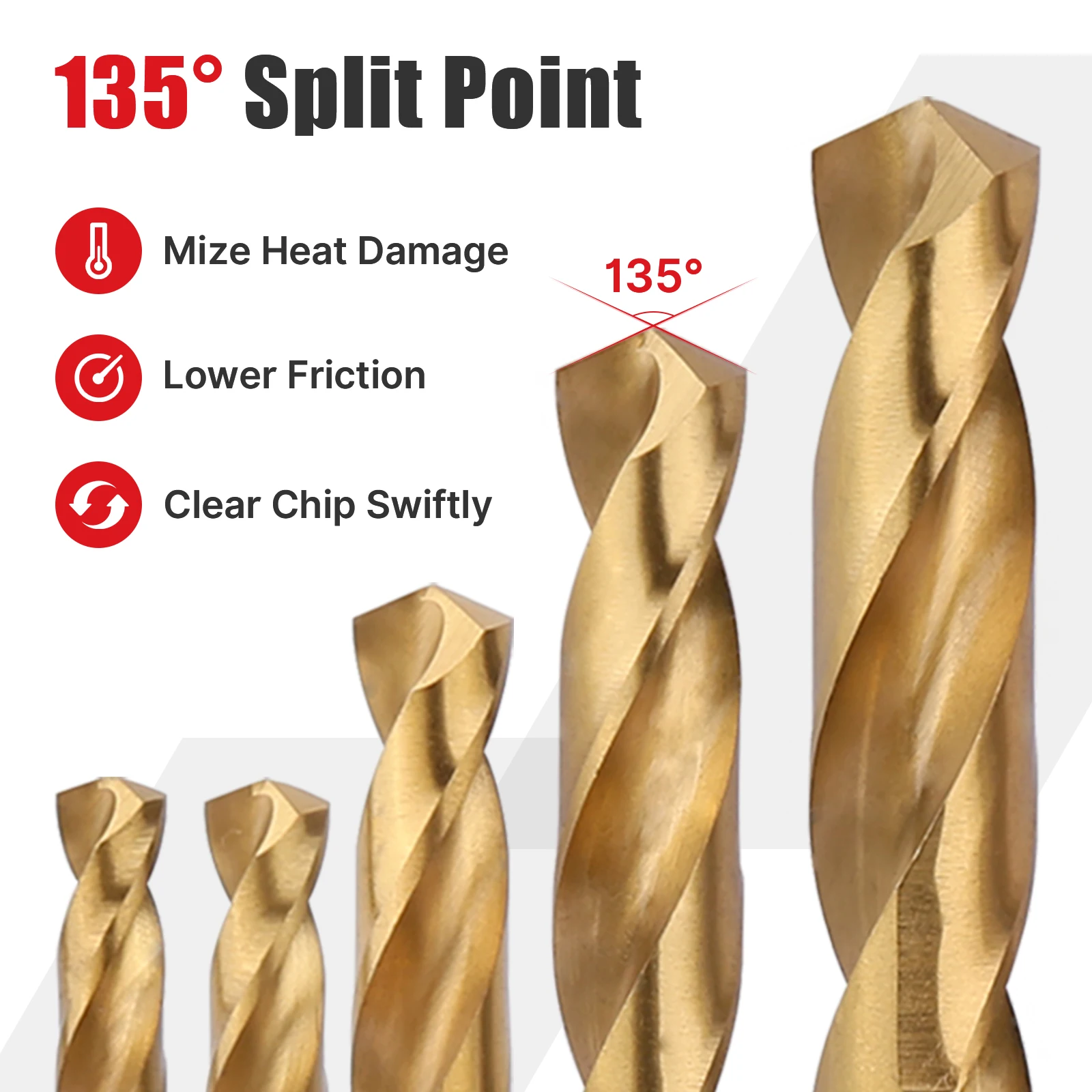 【135 Degrees Split Point and Parabolic Flute】 Easy Cut Split Point design makes drilling easy with less pressure and prevents drill bits walking on the working surface. Fully ground modified parabolic twist flute design clears chips quickly, decreases friction and heat damage.