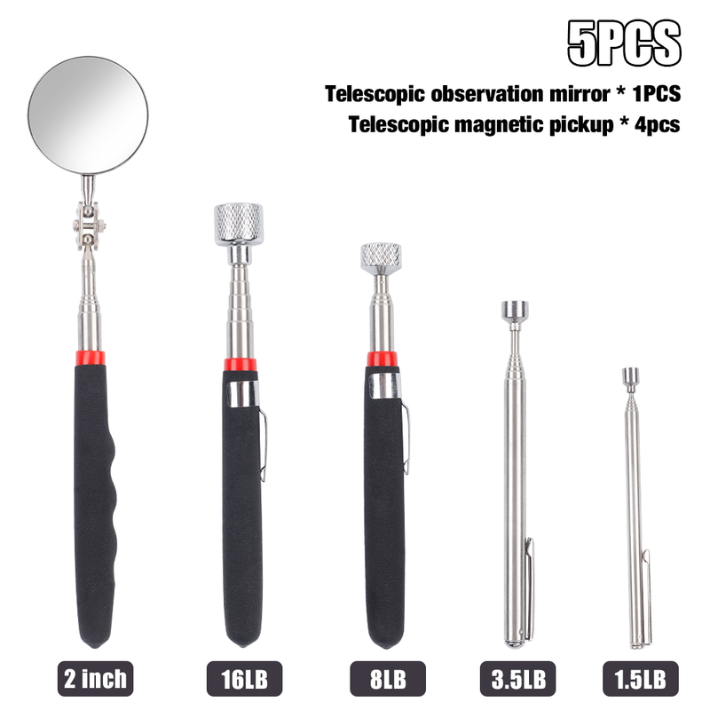 Bearing Capacity: Package includes 4 magnetic pickup tools, a round mirror and inspection mirror, bearing loads of 1.5 lbs, 3.5 lbs, 8 lbs and 16 lbs respectively, these tools are lightweight and enduring, an indispensable help in your daily life