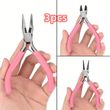 This jewelry tool kit includes needle nose pliers, round wire cutter, and curved nose pliers, ideal for various beading and repair tasks.