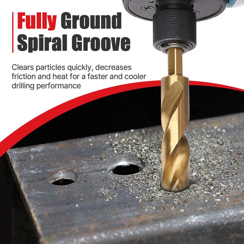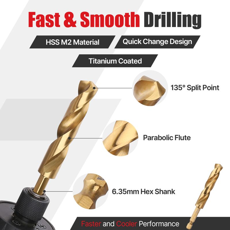 【135 Degrees Split Point and Parabolic Flute】Vearter Easy Cut Split Point design makes drilling easy with less pressure and prevents drill bits walking on the working surface. Fully ground modified parabolic twist flute design clears chips quickly, decreases friction and heat damage.