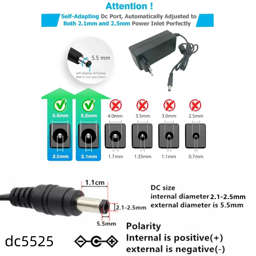 Please note !!that this product is a power supply adapter, not a lithium battery charger, and cannot charge lithium batteries. It directly provides a constant current and constant voltage DC power output device for electronic products. Please distinguish whether your product contains a battery or not, and do not confuse. Also, please note that the connector socket is DC5525 (which means the outer diameter is 5.5 millimeters and the inner diameter is 2.1-2.5 millimeters for universal use). Please check it correctly before purchasing. If you do not know the data, please refer to the data in the picture introduction or consult the seller's customer service. Please measure the size of your own power socket to avoid errors and losses. We do not assume any responsibility, and buyers are advised to read it carefully!!!