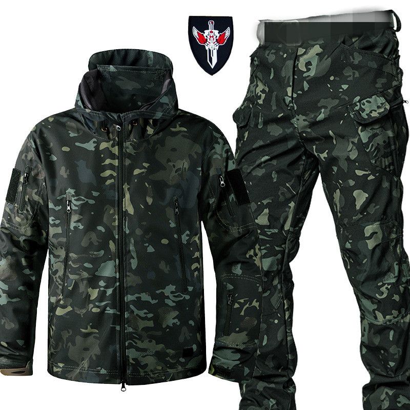 Camo Hooded Fleece Tactical Set Mens Waterproof Thick Shark Skin Soft Shell Jackets Male Warm Multi-pocket Hiking Pants